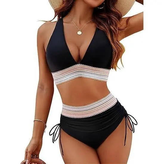 European and American style two-piece swimsuit for women, sexy solid color V-neck tight-fitting backless high-waisted bikini, women's swimsuit