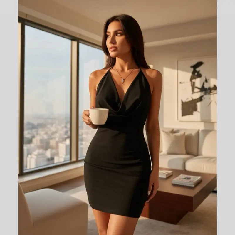 ! The "Velvet Nocturne" dress is a masterpiece of sophistication and power: crafted in luxurious black velvet, it hugs the body with a halter cut that boldly exposes the shoulders. The plunging V-neckline and the completely open back, tied at the neck, create a bold, yet elegant silhouette—perfect for an unforgettable night.