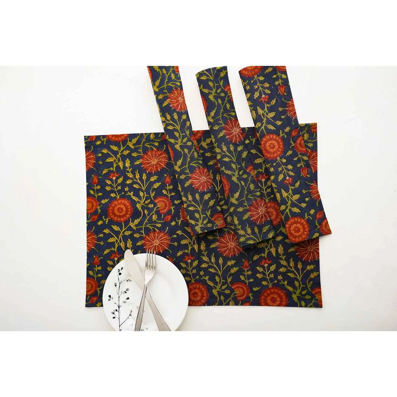 Rich in color and craft, these handblock printed placemats feature bold marigold blooms and golden vines against a deep navy ground. A striking base for your holiday table, yet versatile enough for year-round dining. Each piece is crafted in thick cotton 40s for durability and long-lasting use.
