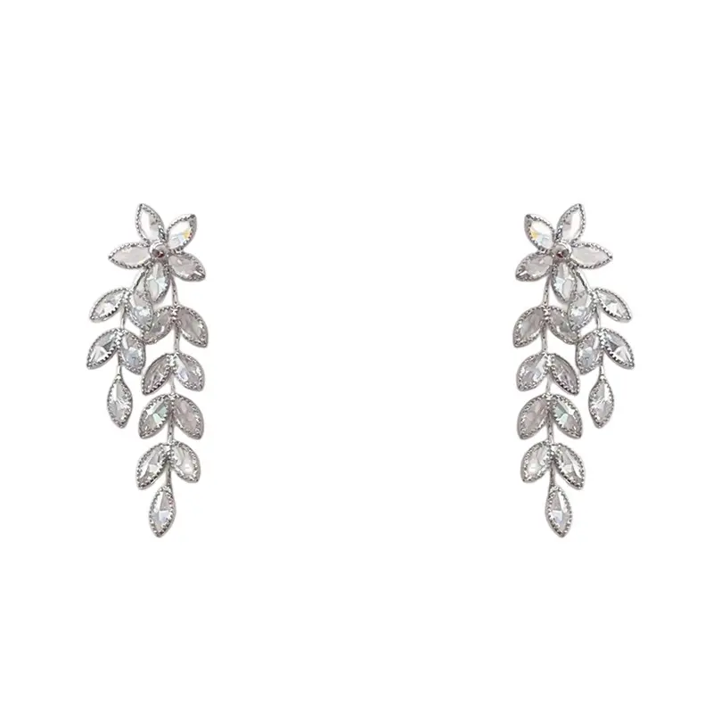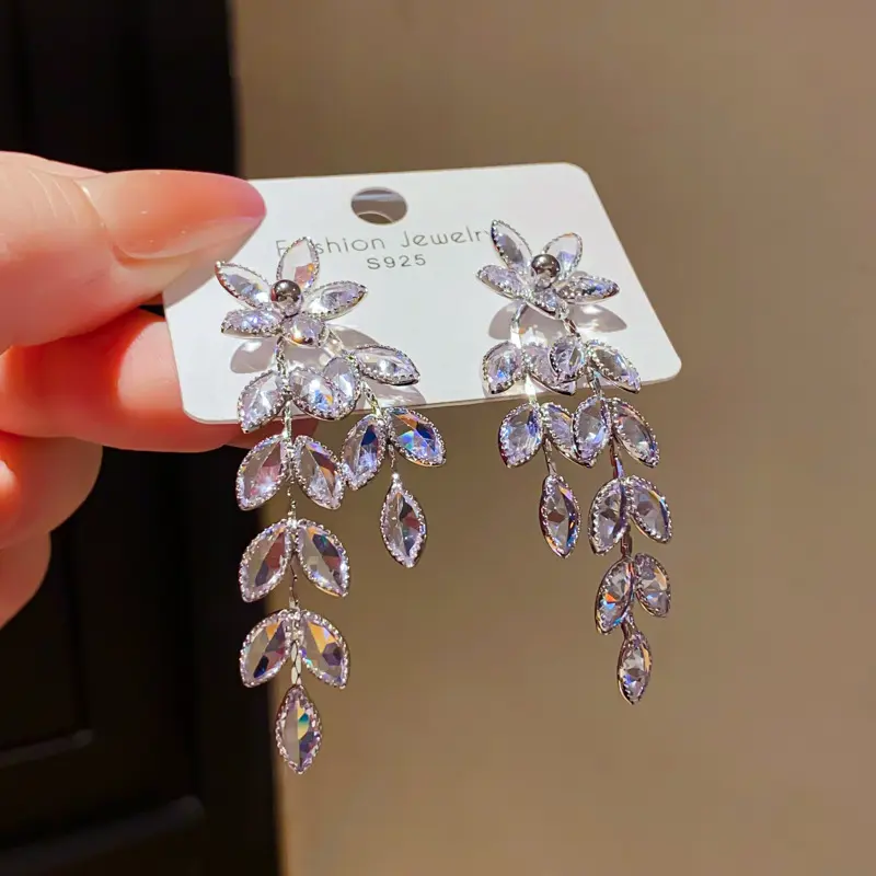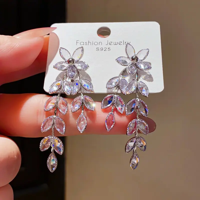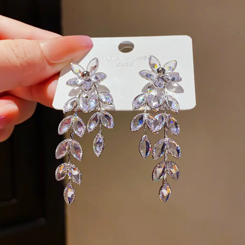 Light Luxury Zircon Flower & Leaf Tassel Earrings, European & American Minimalist Style, Unique Elegant Personality & High-End Jewelry