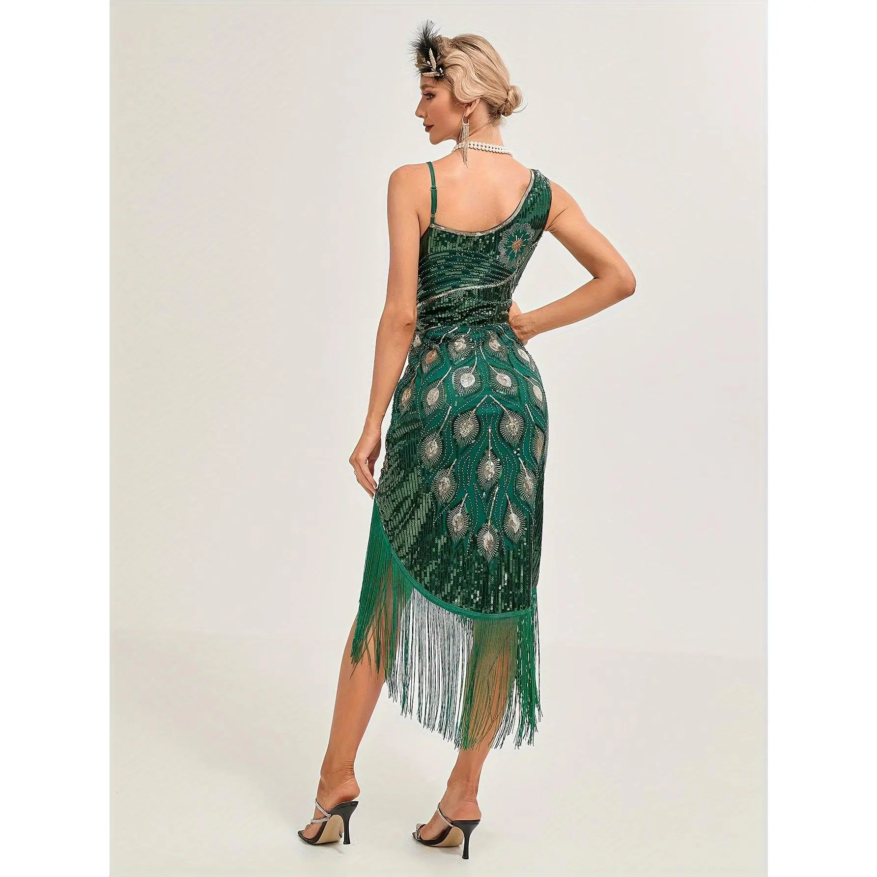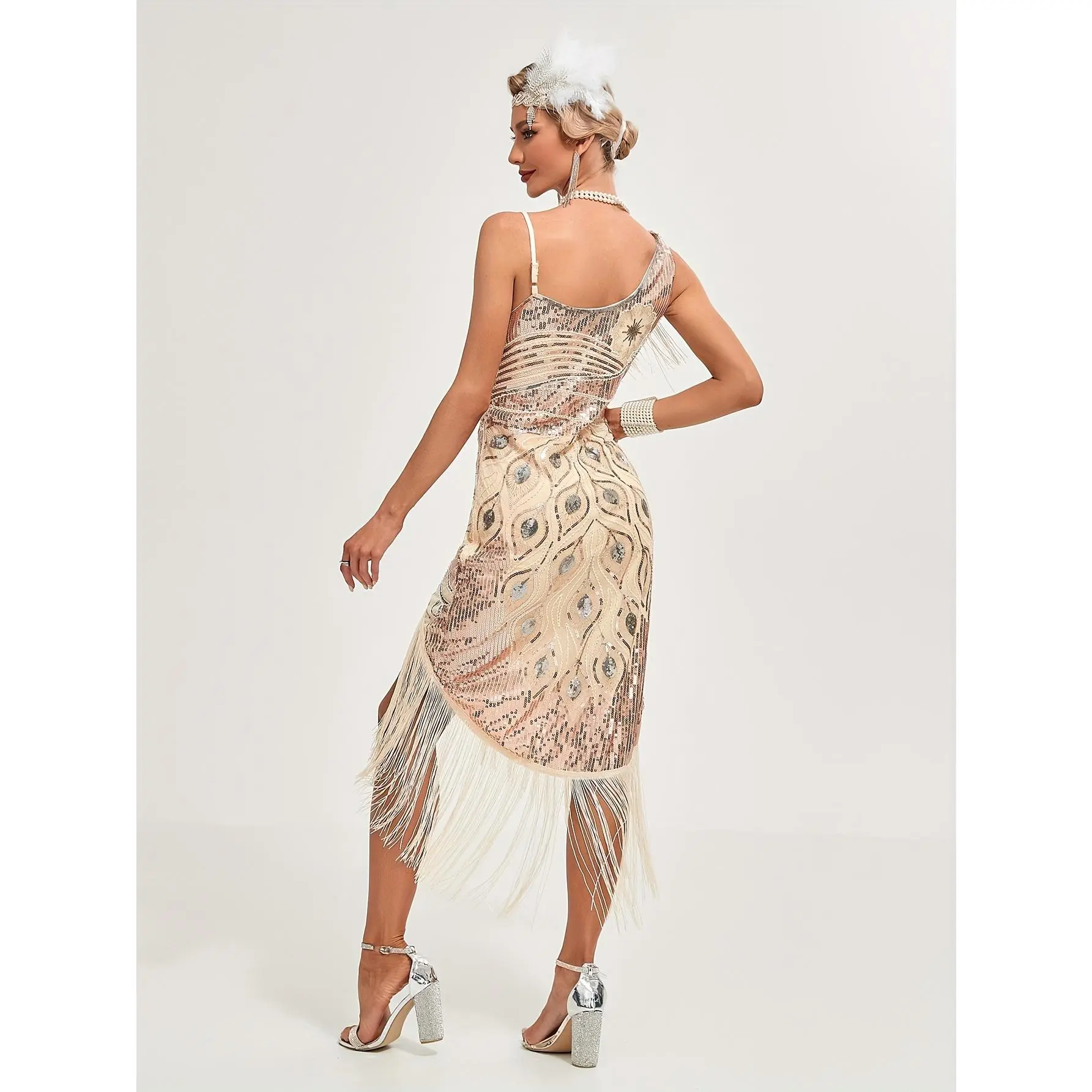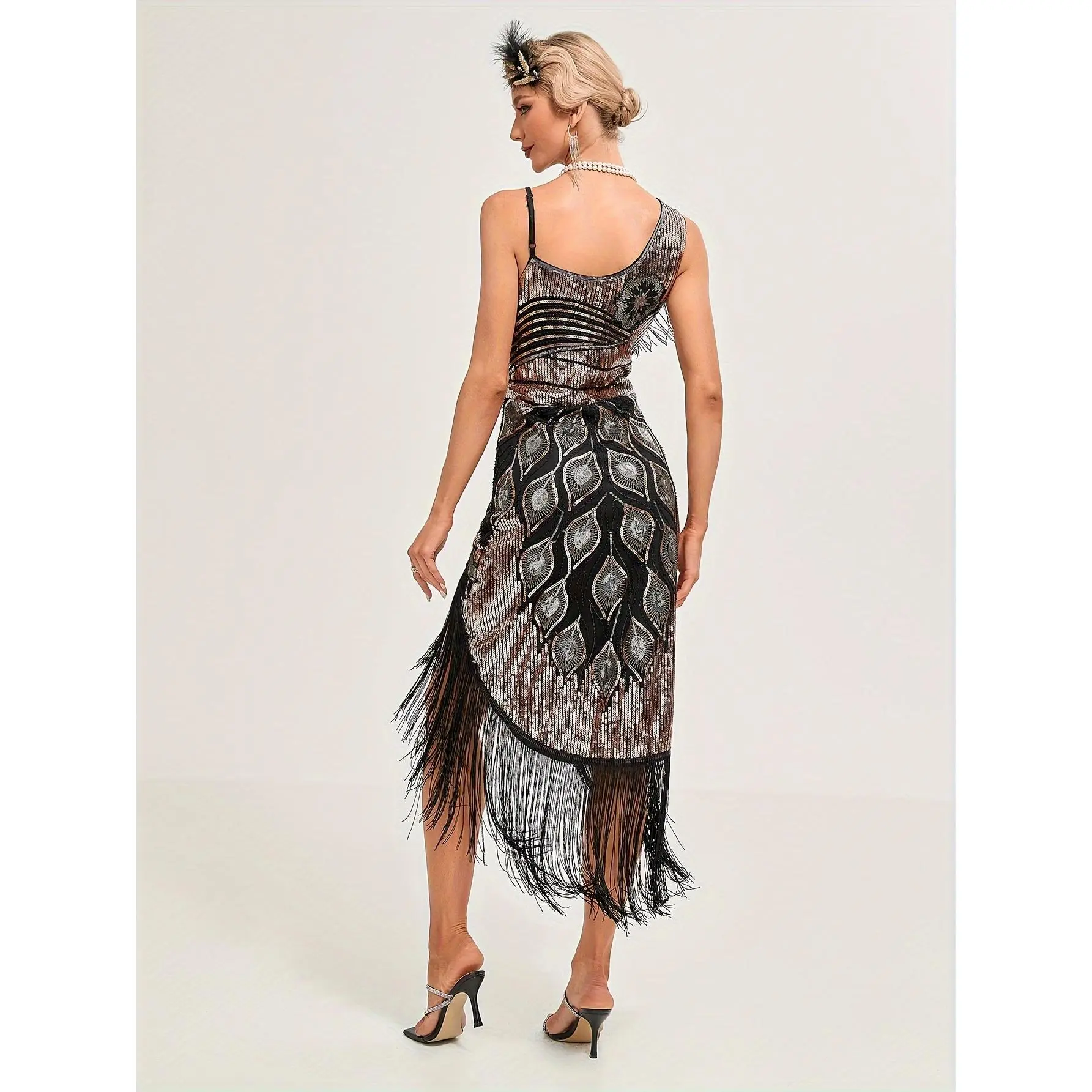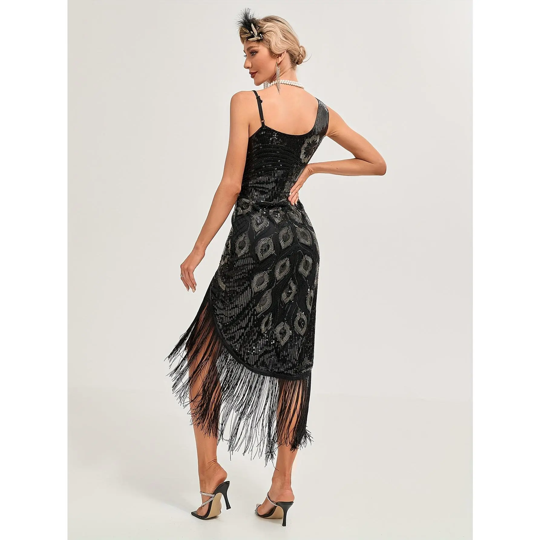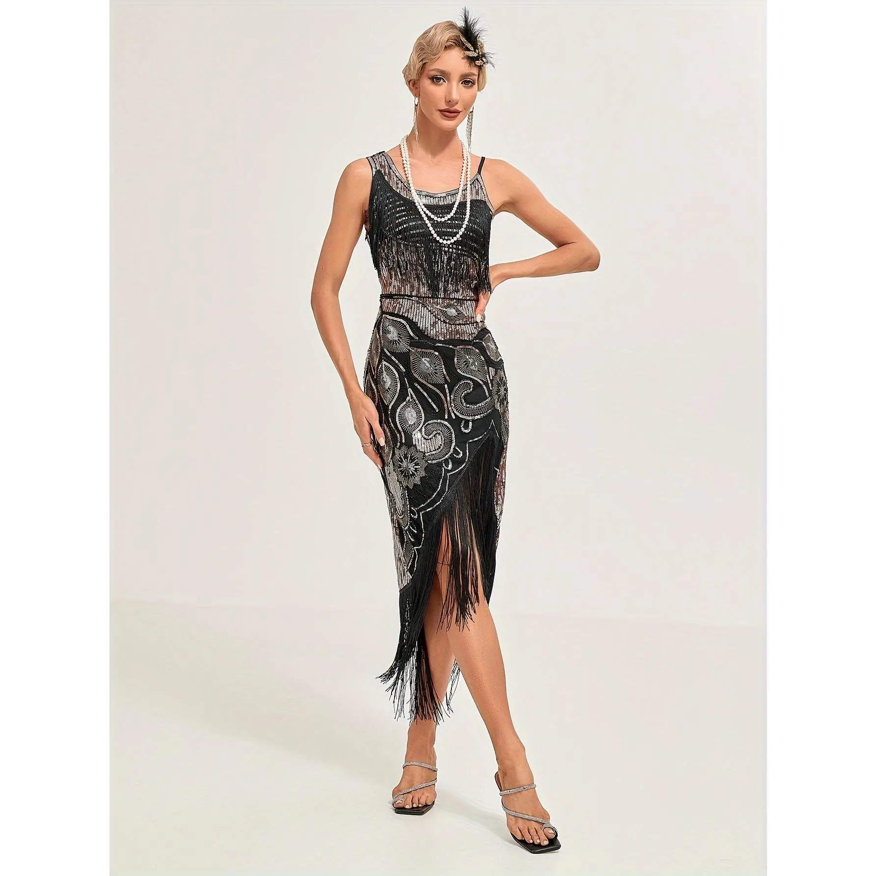 Sequined Fringe Hem Flapper Dress, Vintage Sleeveless Bodycon Dress For Party & Banquet, Women's Clothing