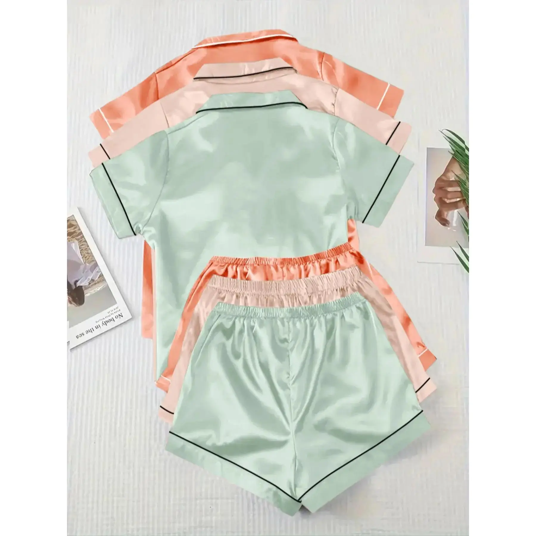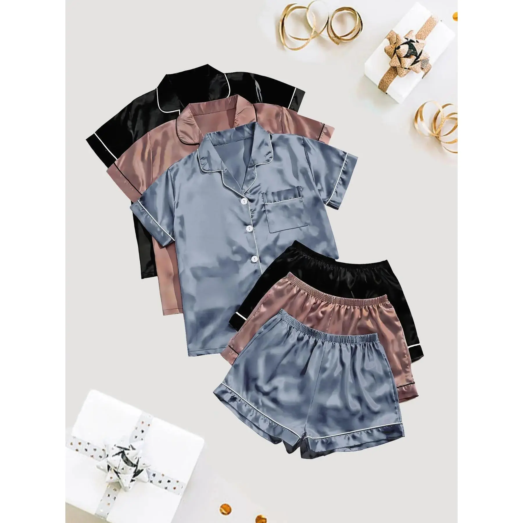 Women's Solid Satin Pyjama Set, Short Sleeve Button Front Lapel Shirt & Contrast Binding Shorts PJ Set, Summer Sleepwear Set Matching Casual Pajamas Loungewear Womenswear women's pajamas set