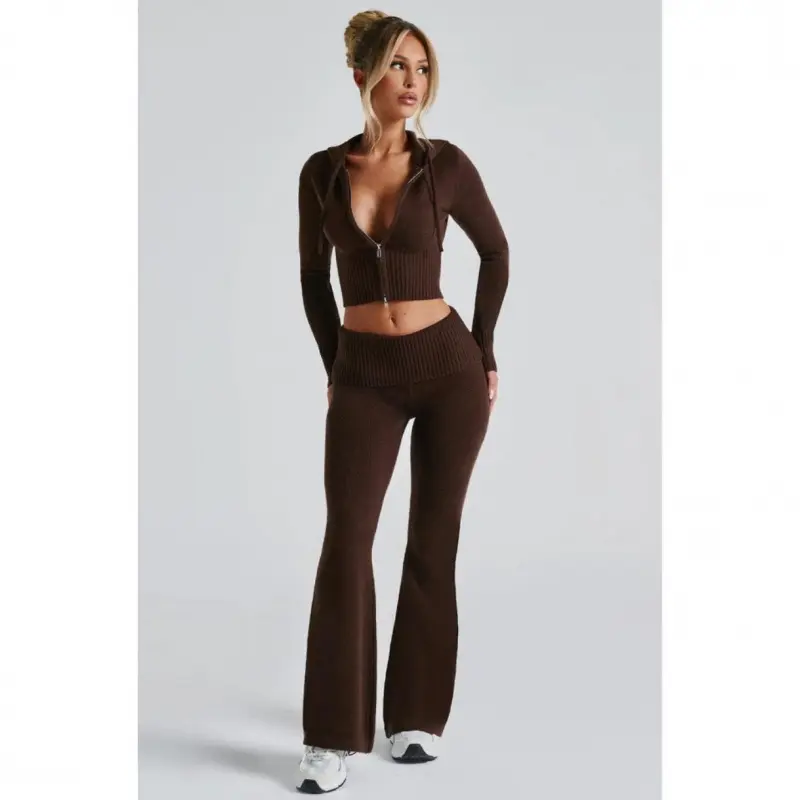 This cute set is a must slipping on in the chilly seasons to come.Designed in soft stretchy ribbed knit, this sweater set features an on trend flare legs and matching cropped hoodie.