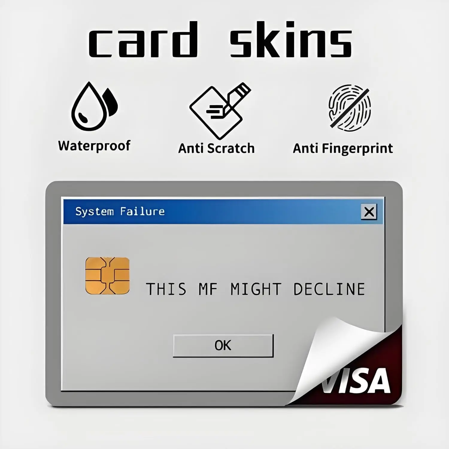 Add personality to your wallet with this system error message themed credit card skin. Designed for a fun pop culture look, it instantly transforms your plain card into a stylish and eye-catching accessory while protecting it from scratches and daily wear.