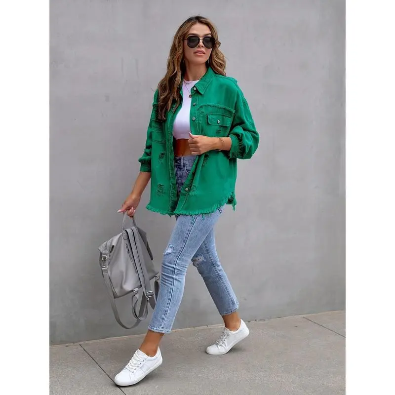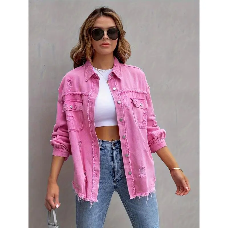 Womenswear Solid color mid-length ripped long sleeve denim jacket distressed shacket Fashion Casual Comfort denim bomber jacket Tops Shirt Vintage Coat