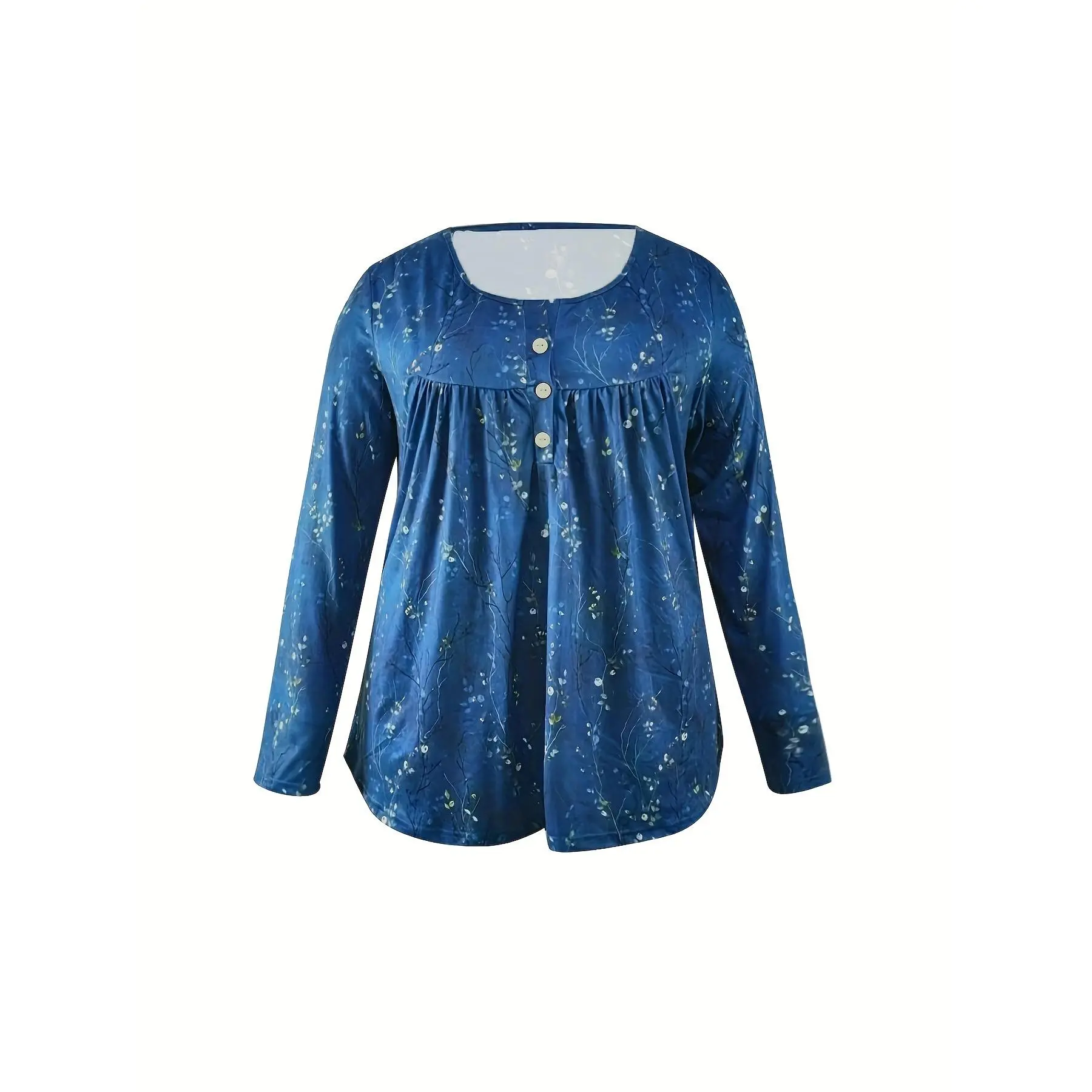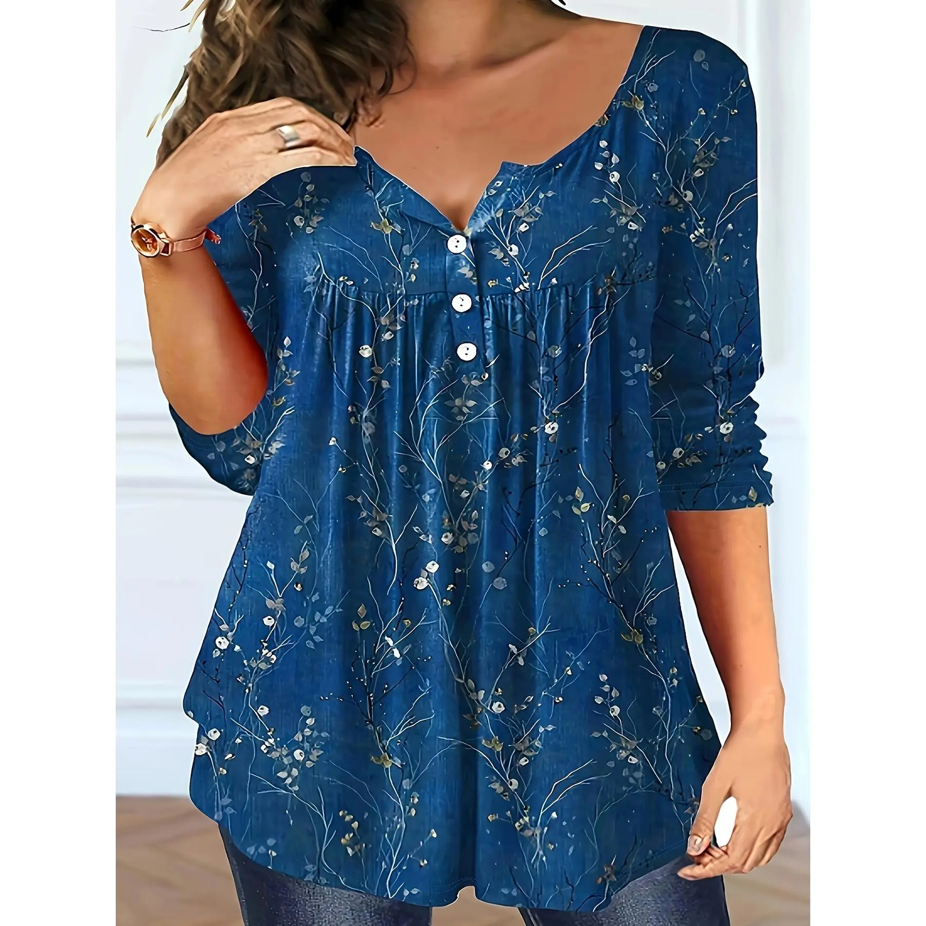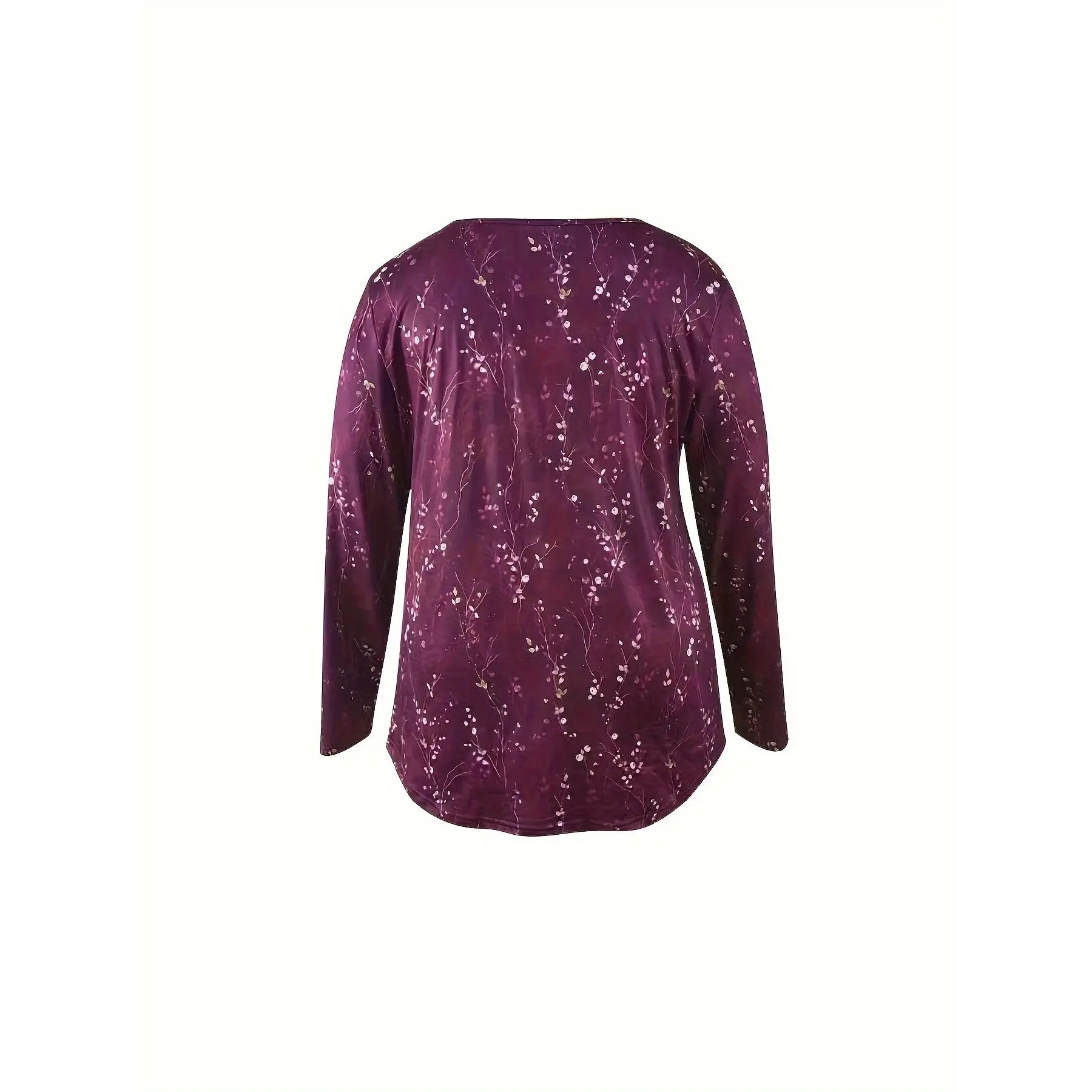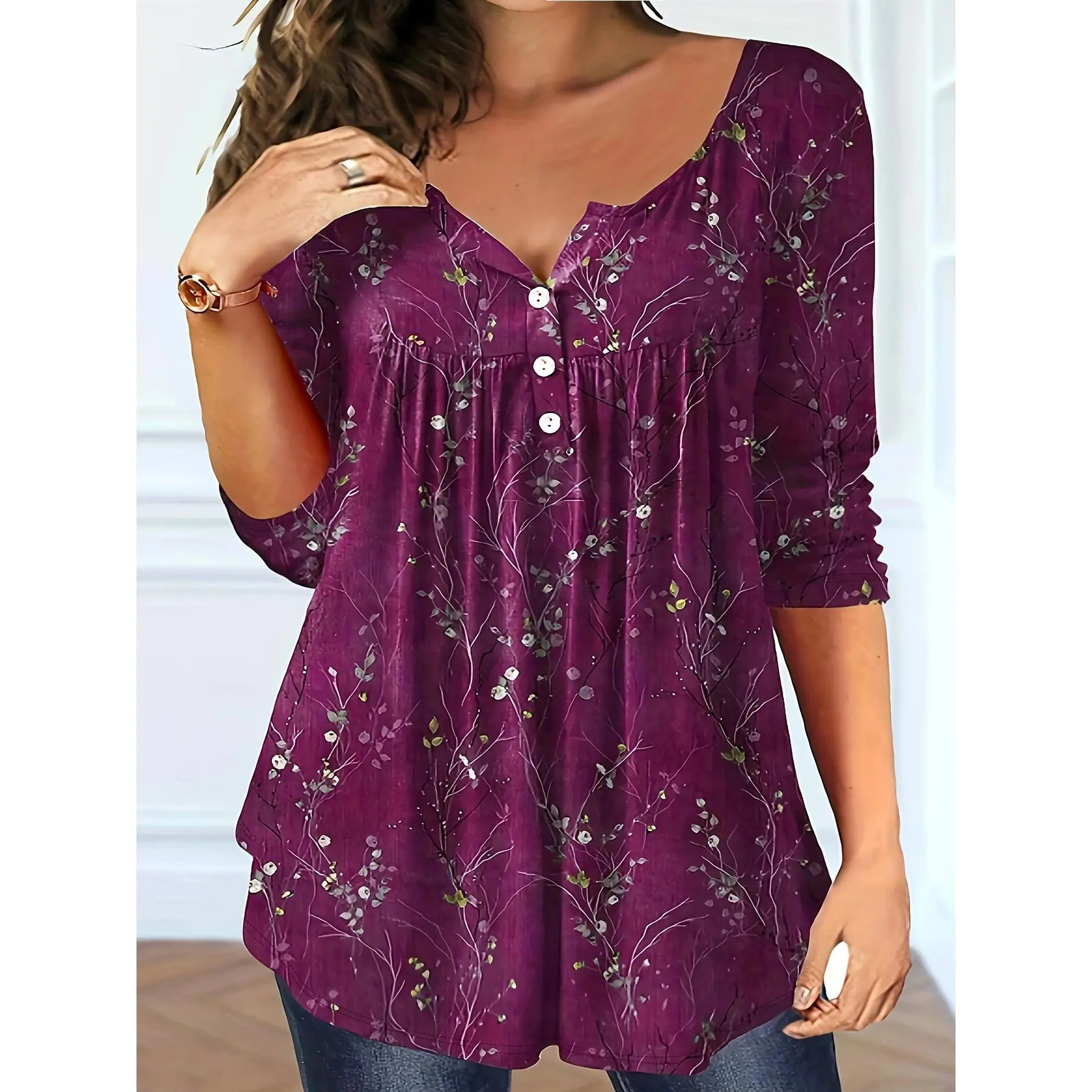 Plus Size Casual T-shirt, Women's Plus Floral Print Button Up Ruched Long Sleeve V Neck Medium Stretch T-shirt