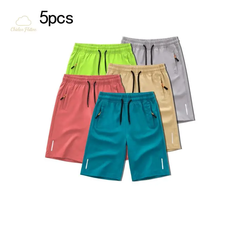ASE-5pcs Boys' Summer Sports Shorts, Polyester 95%, Elastane 5%, Slight Stretch, Solid Color, Regular Fit, with Drawstring and Zip Pockets, Ages 12 and Under, Outdoor