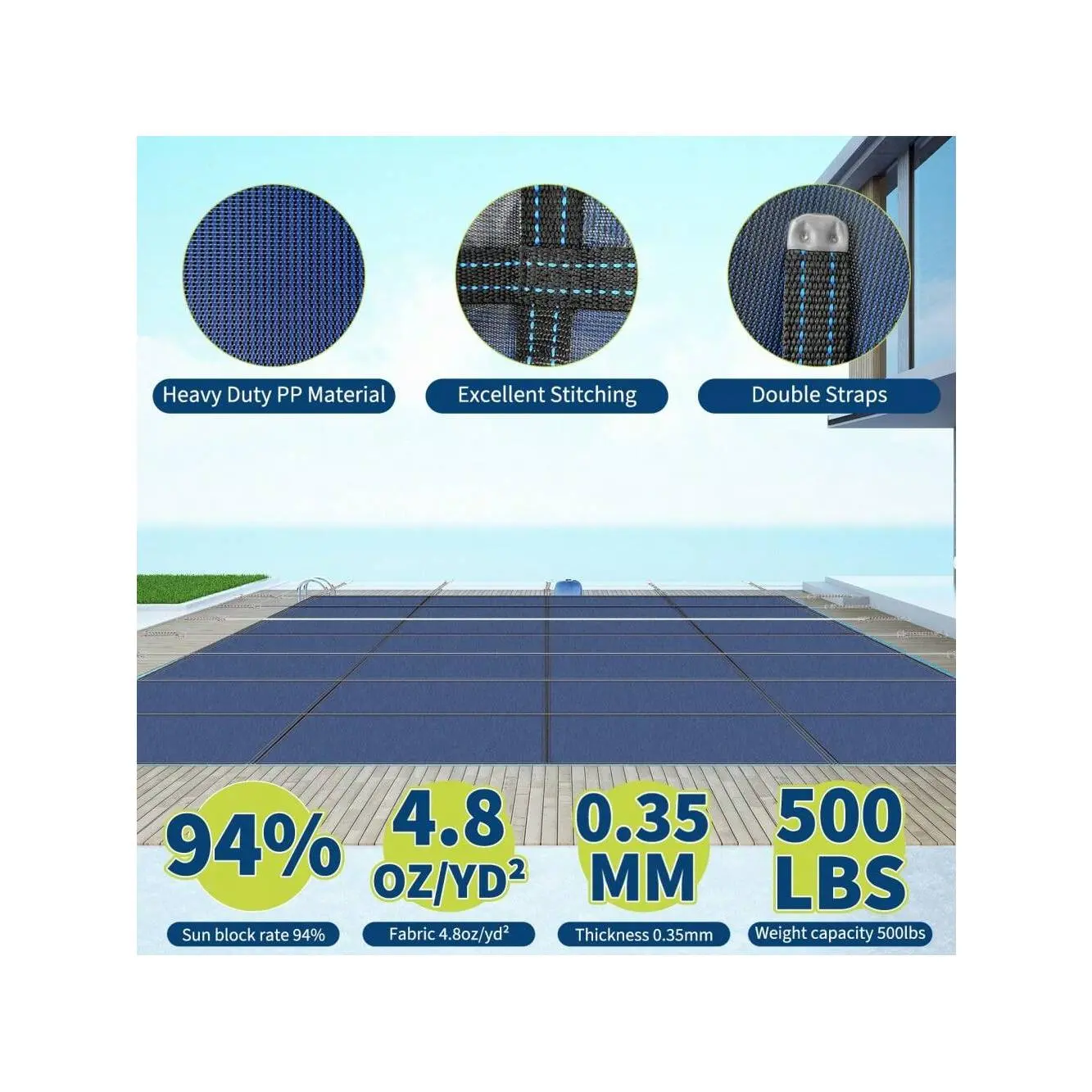 EXCELLENT STITCHING AND SUN BLOCK : The cover is crafted with double-strapped and triple-stitched details,making it extremely durable for years to come. Sun block rate is about 94% which can keep your water clear.