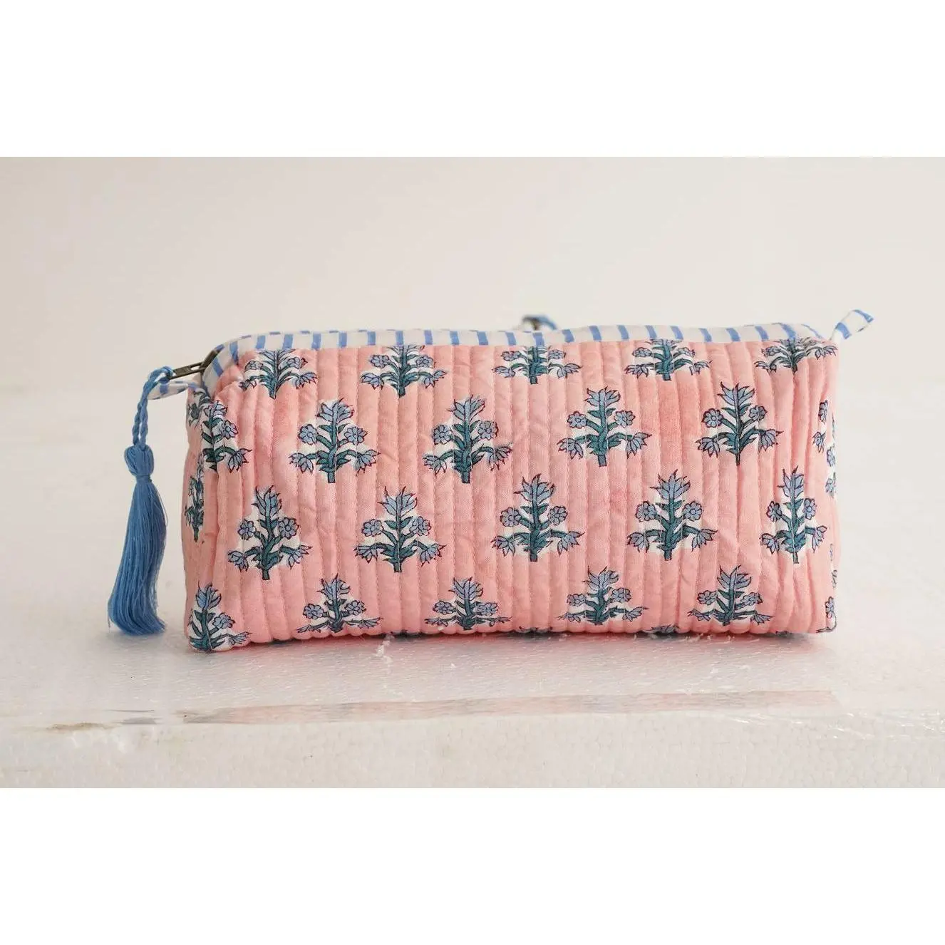 Handcrafted with artisanal blockprinting, this quilted pouch is designed to keep your essentials beautifully organized. The soft rose base with indigo floral motifs is paired with a striped trim, brass zipper, and tassel pull for a refined finish. Inside, each pouch is lined in soft white cotton voile with utility sections to neatly store your items.