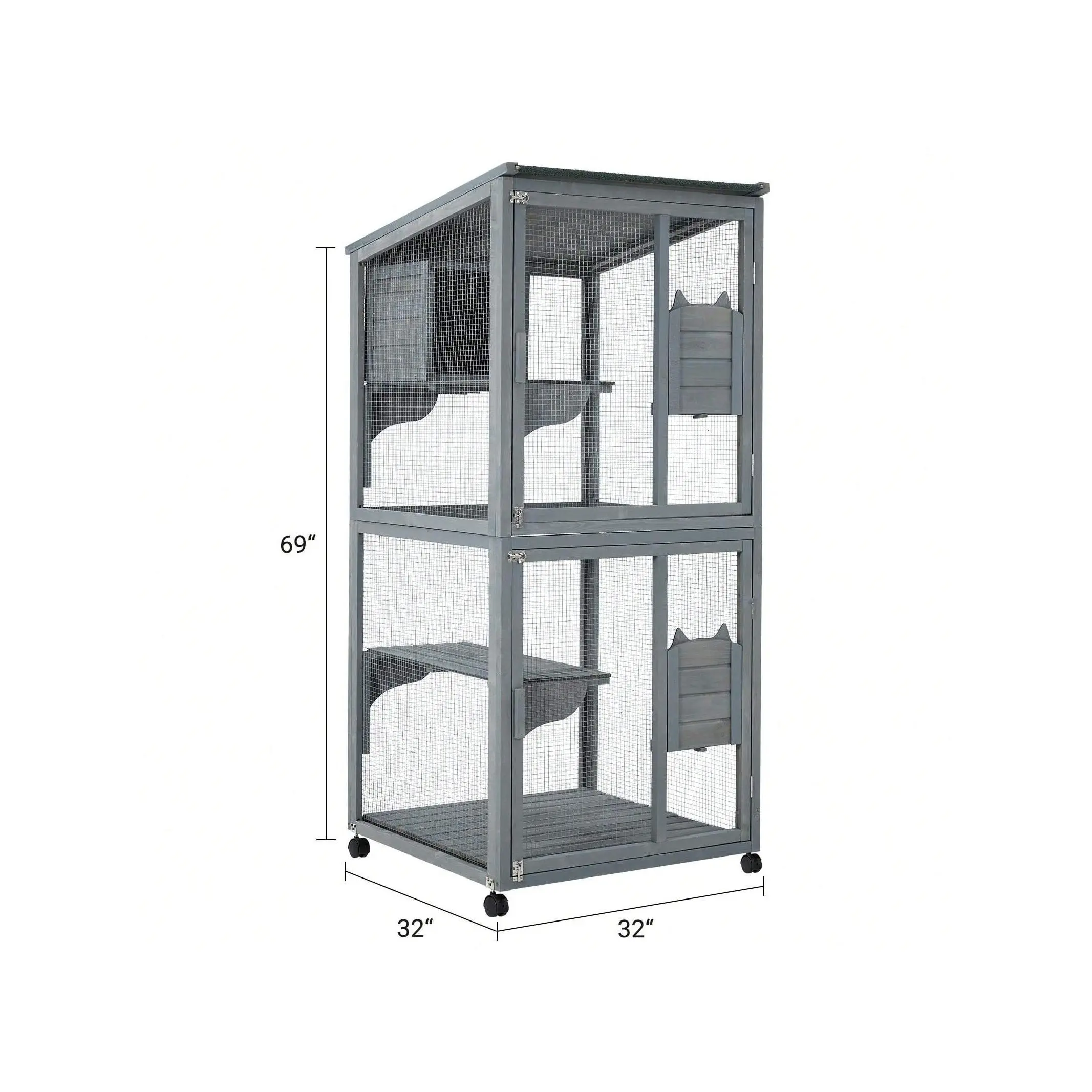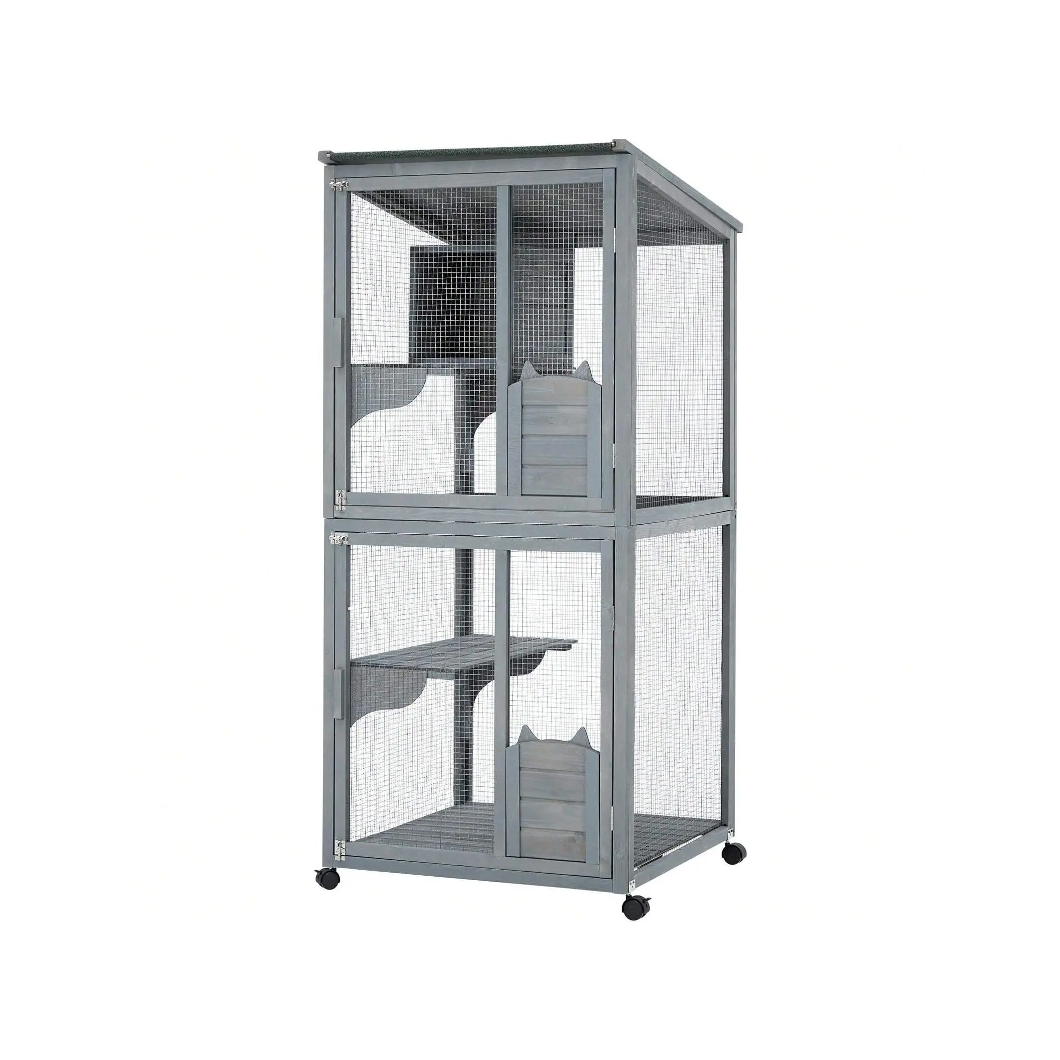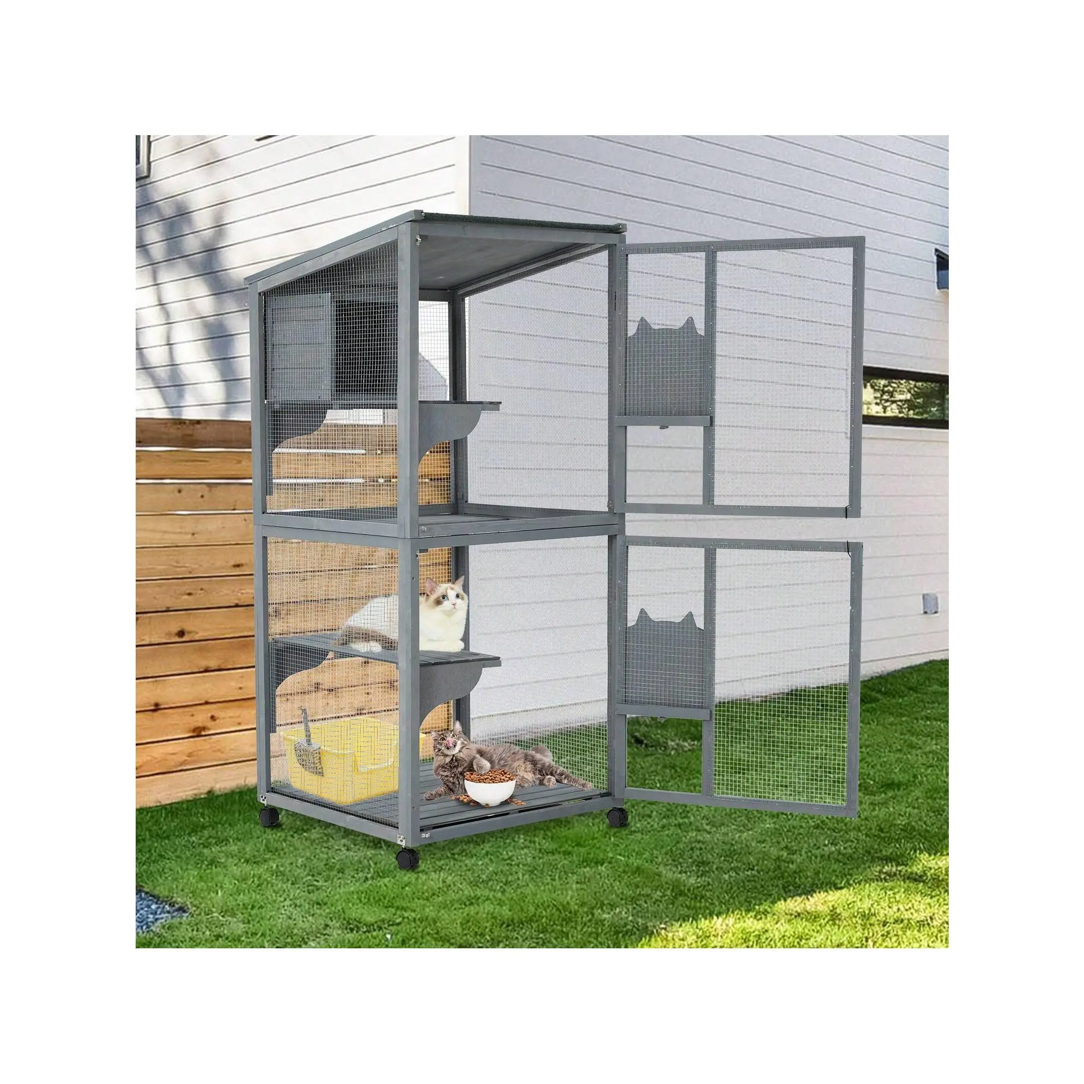Large 2-Tier Outdoor Cat House Small Animal Enclosure With 2 Lockable Doors Catio With Waterproof Cover And Sunshine Panel Roof Portable Kitty House With Resting Boxes & Fixable Wheels