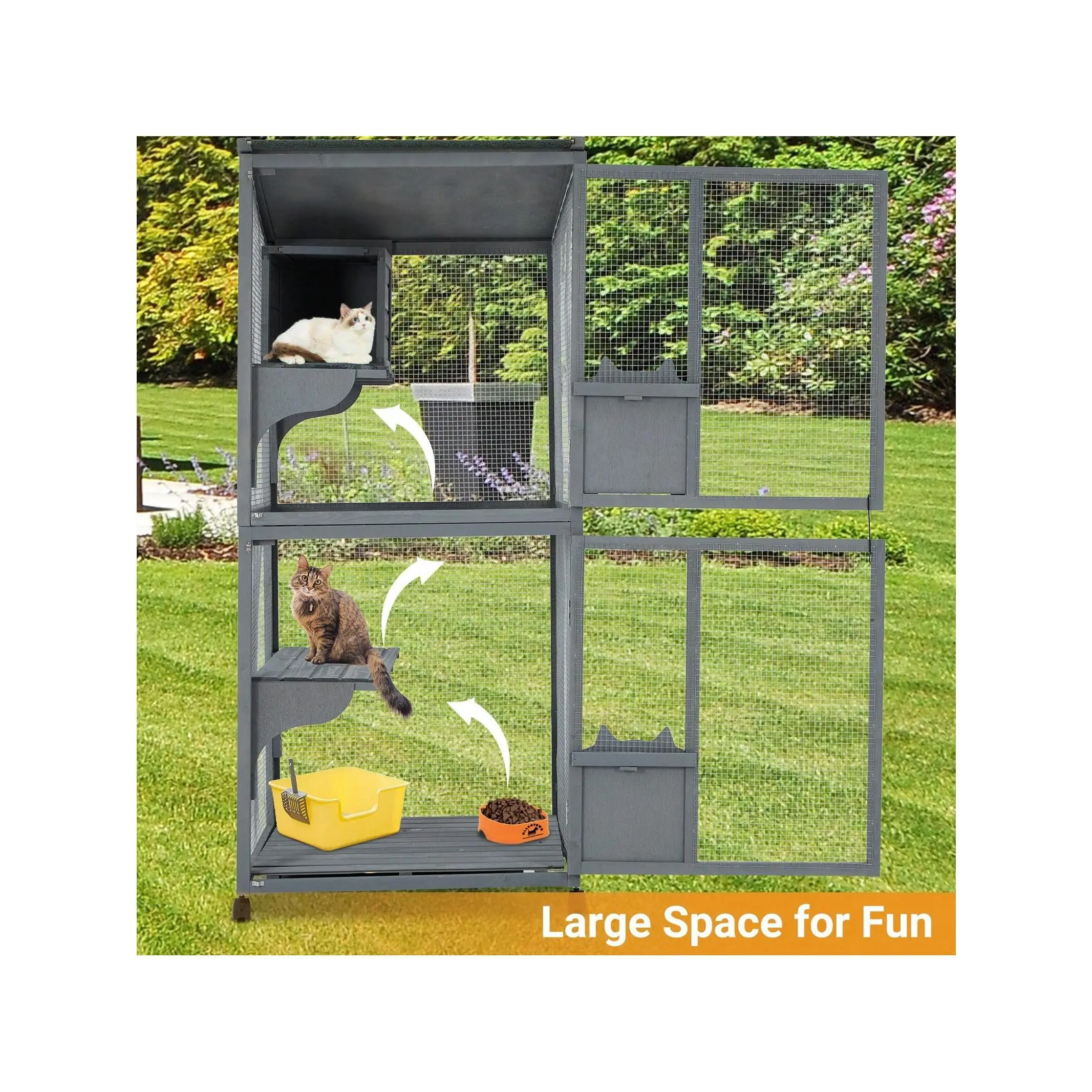 Spacious Multitier Design offers comfortable multilevel activity areas for multiple cats with waterproof sunshade protection and lockable wheels for flexible movable placement