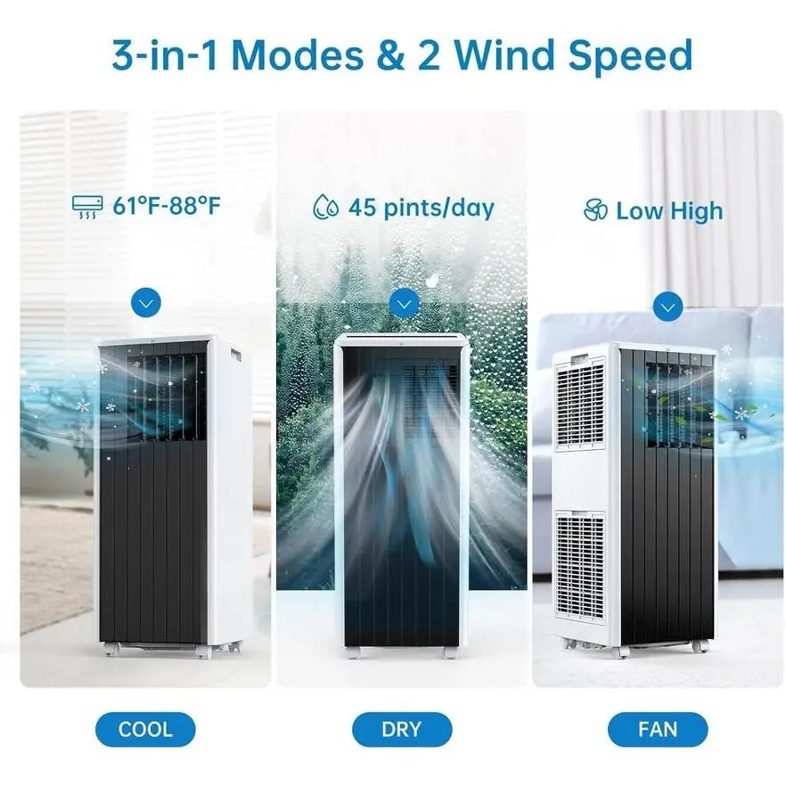 🔄【Versatile 3-in-1 Functionality】This multifunctional AC unit not only cools but also dehumidifies and offers a 3-speed fan. With temperature settings ranging from a brisk 61℉ to a warm 88℉, and a 45-pint daily dehumidification capacity, you can easily tailor your environment using the remote or LED touch panel.