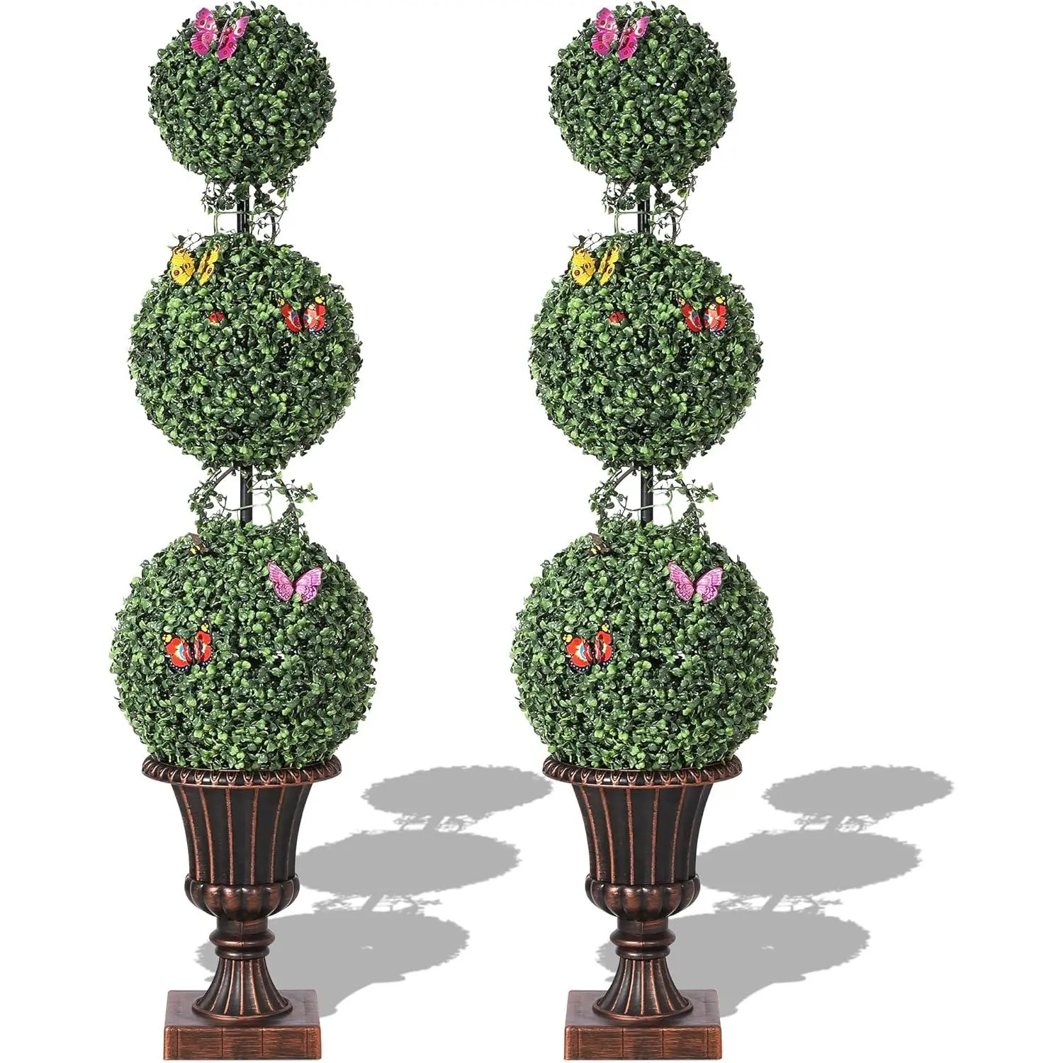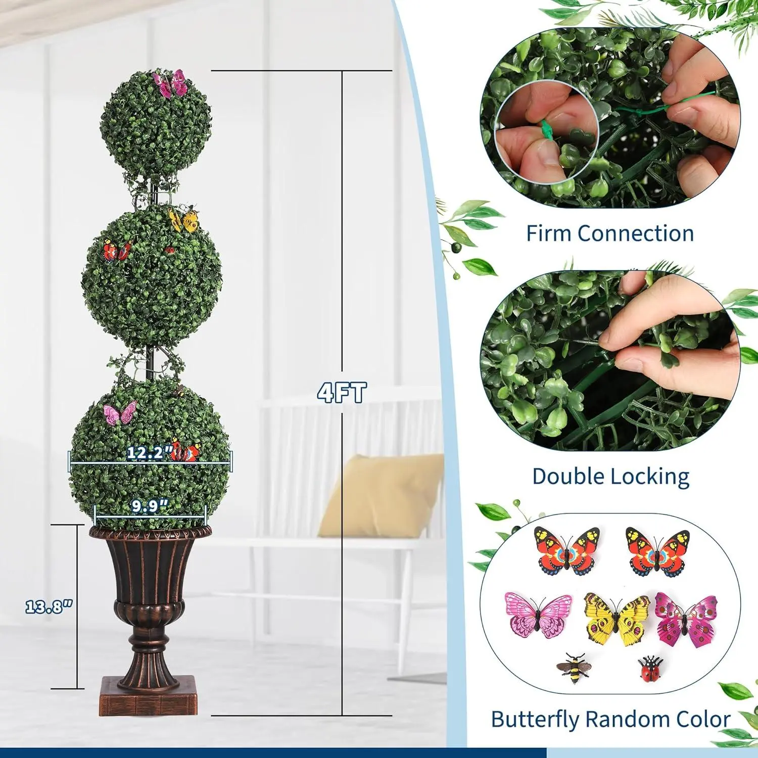 4 FT Artificial Triple Ball Topiary Trees with Trophies Flower Pots  Artificial Plants Outdoor with Vines   Insects Decoration  Topiary Balls Trees for Home Offices Porch Decor Set of 2 Decorative Fruit Gift Ornaments