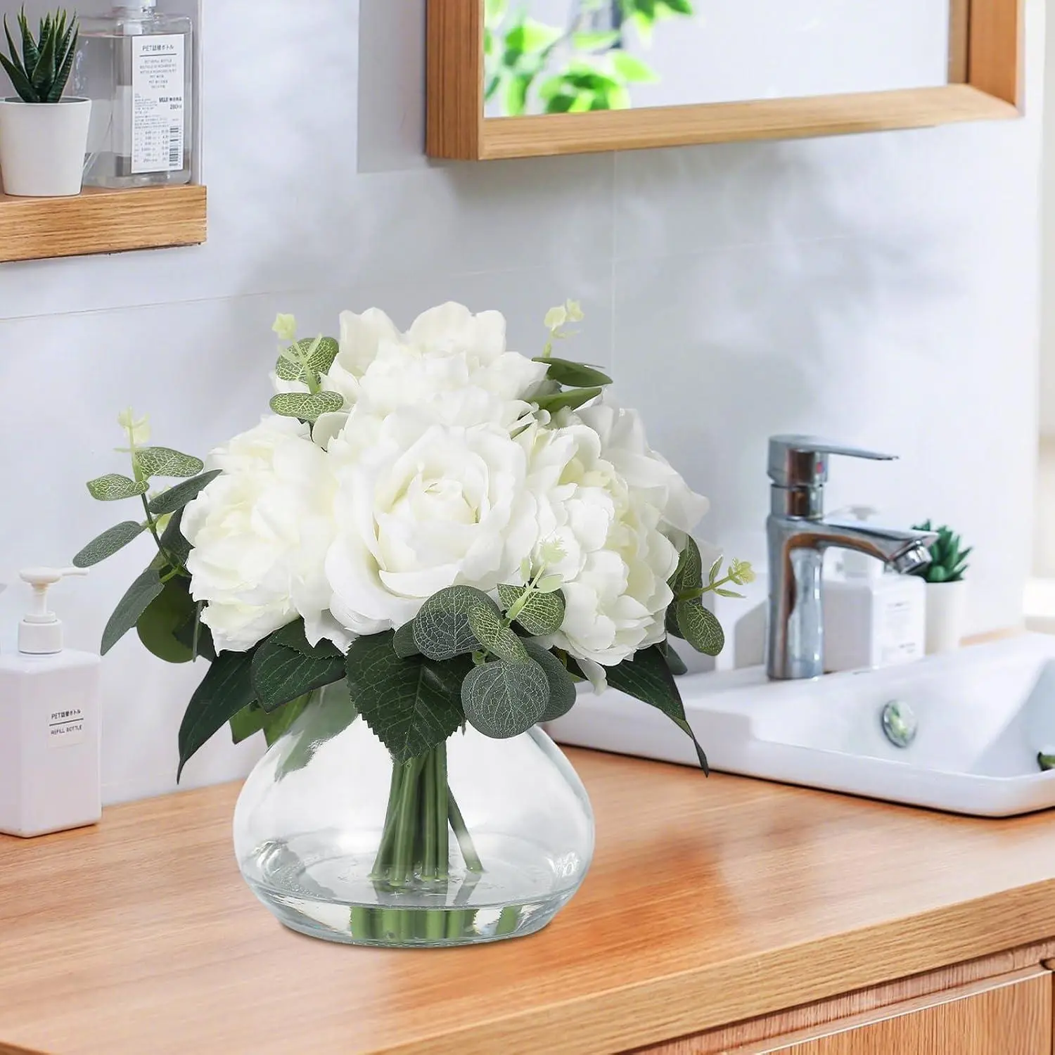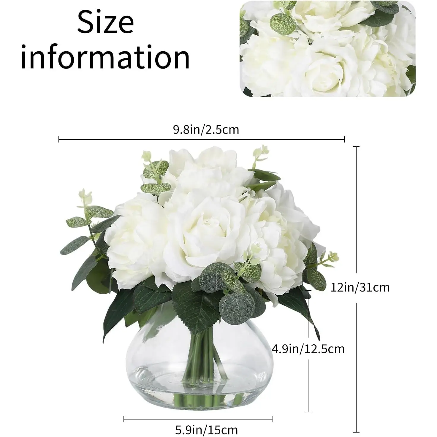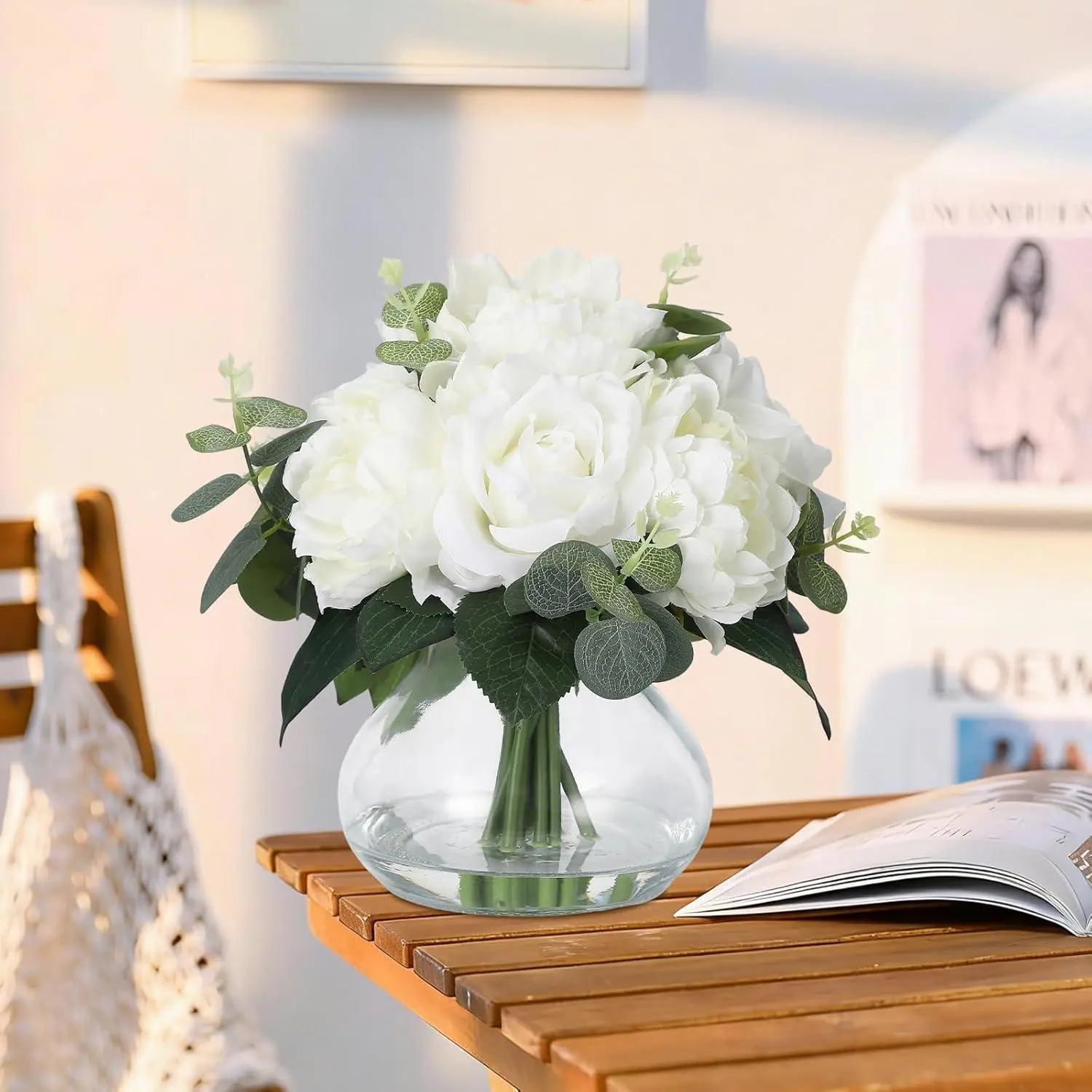 4 Roses & 4 Peonies Artificial Flowers in Glass Vase, Real Touch Silk Flower Bouquet with Faux Water for Wedding Centerpieces, Home Table Decor, Dining Room Decorations (White)