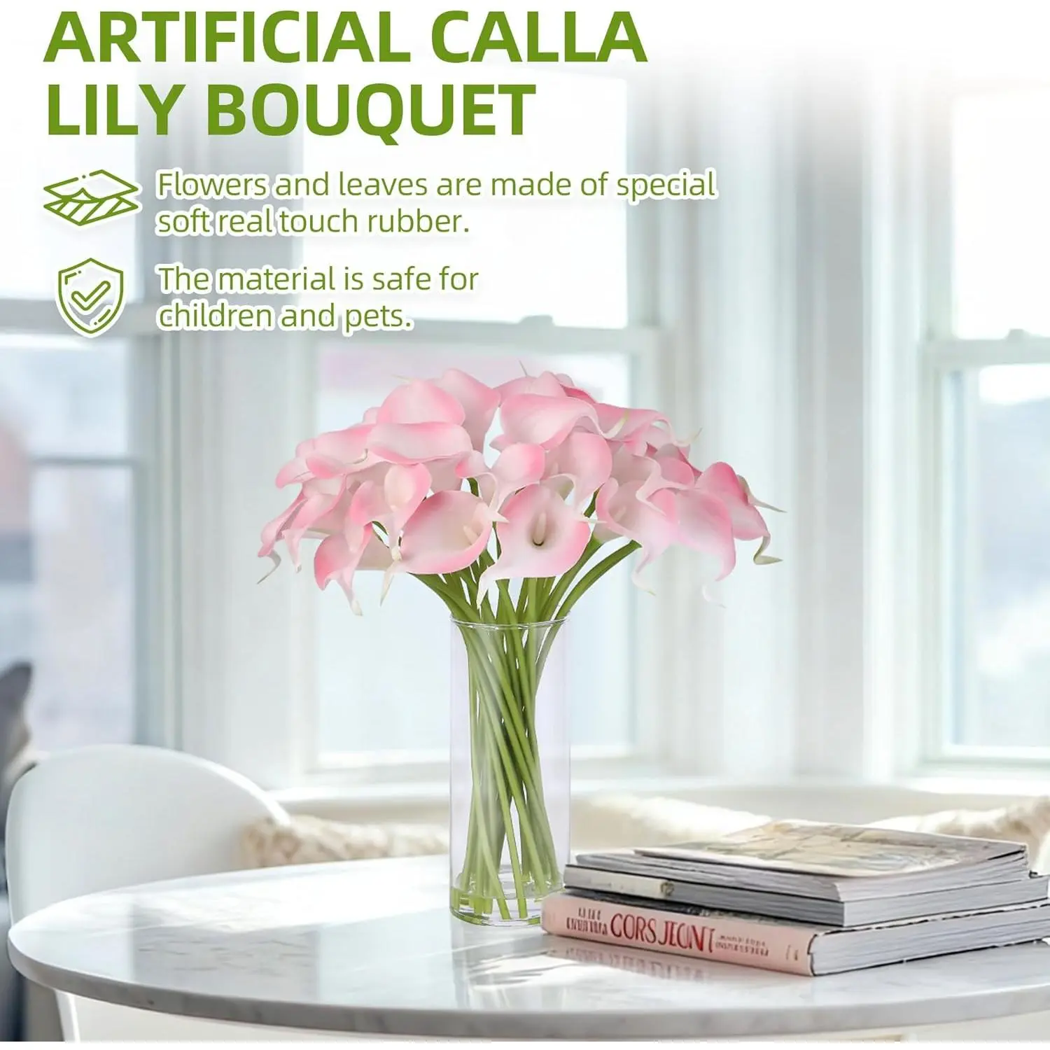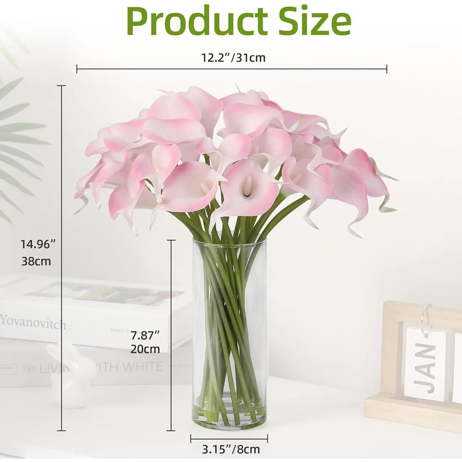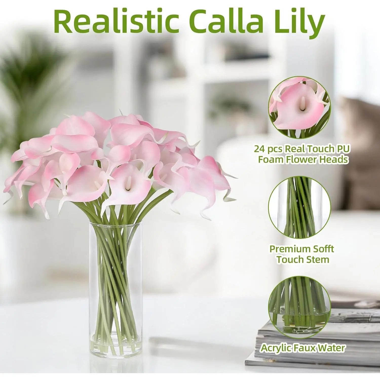 🌸 PERFECTLY CRAFTED WITH REALISTIC DETAILS: Our artificial calla lilies feature hyper-realistic latex petals that mimic the delicate veins and silky texture of fresh flowers. Each of the 24 stems is carefully designed with lifelike curves and natural color gradients, arranged in a classic glass vase filled with crystal-clear faux water to create an ever-fresh, dew-kissed look that never fades or wilts. Available in three elegant colors: vibrant Yellow, pure White, and soft Pink.