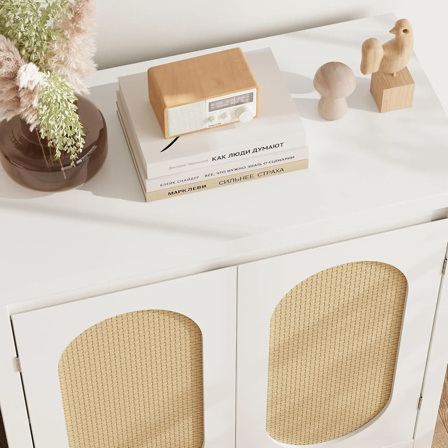 Clear fluted glass doors allow display of dishes decor or books while protecting from dust making it ideal as coffee bar or accent cabinet