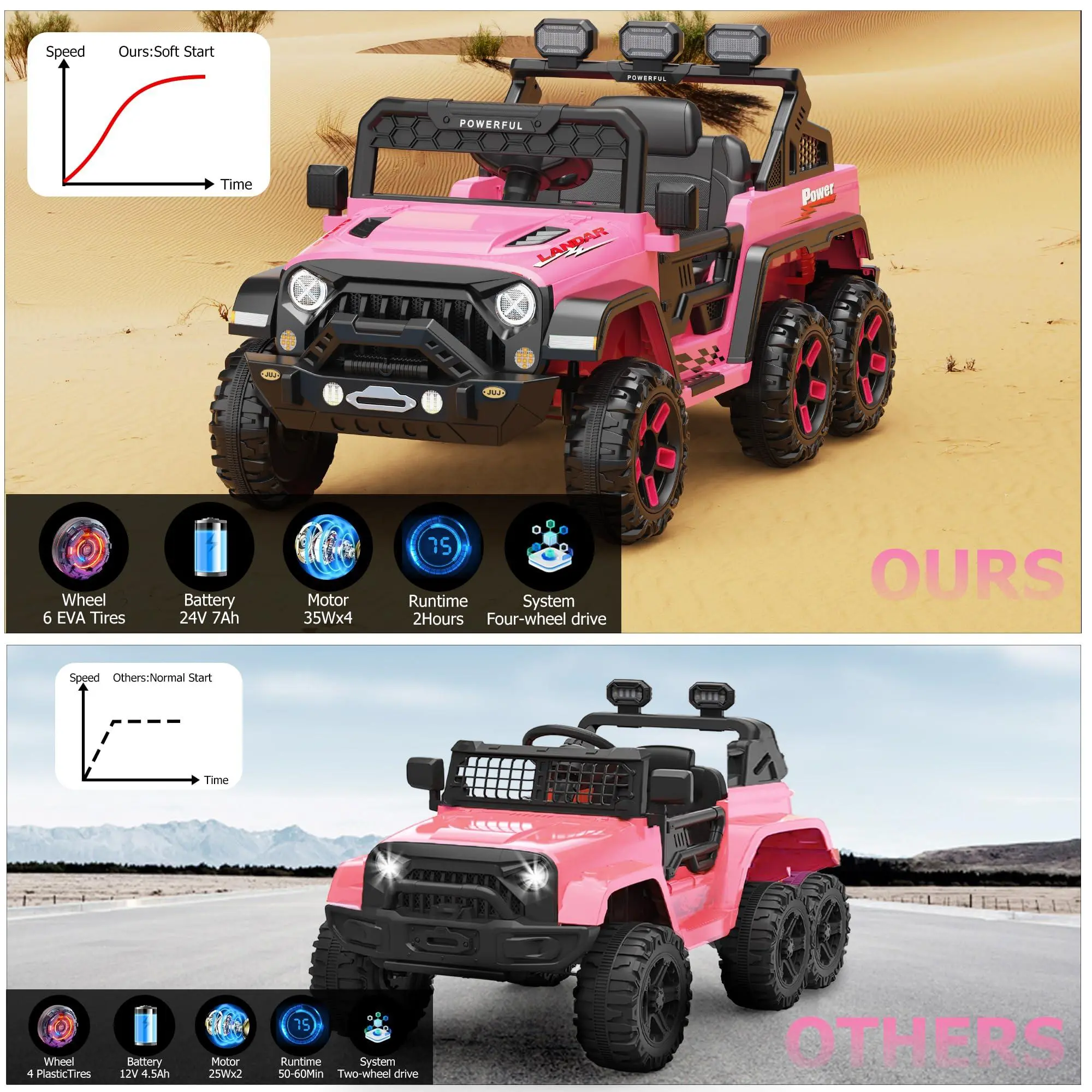 Superior Performance: Powered by a 24V battery with four drive, this kids ride on toys offers three-speed options: 1.2-3.7 mph. The battery life ranges from 50 minutes to 2 hours, varying based on usage and speed. Enjoy safe outdoor fun with a 98ft remote control range for worry-free play