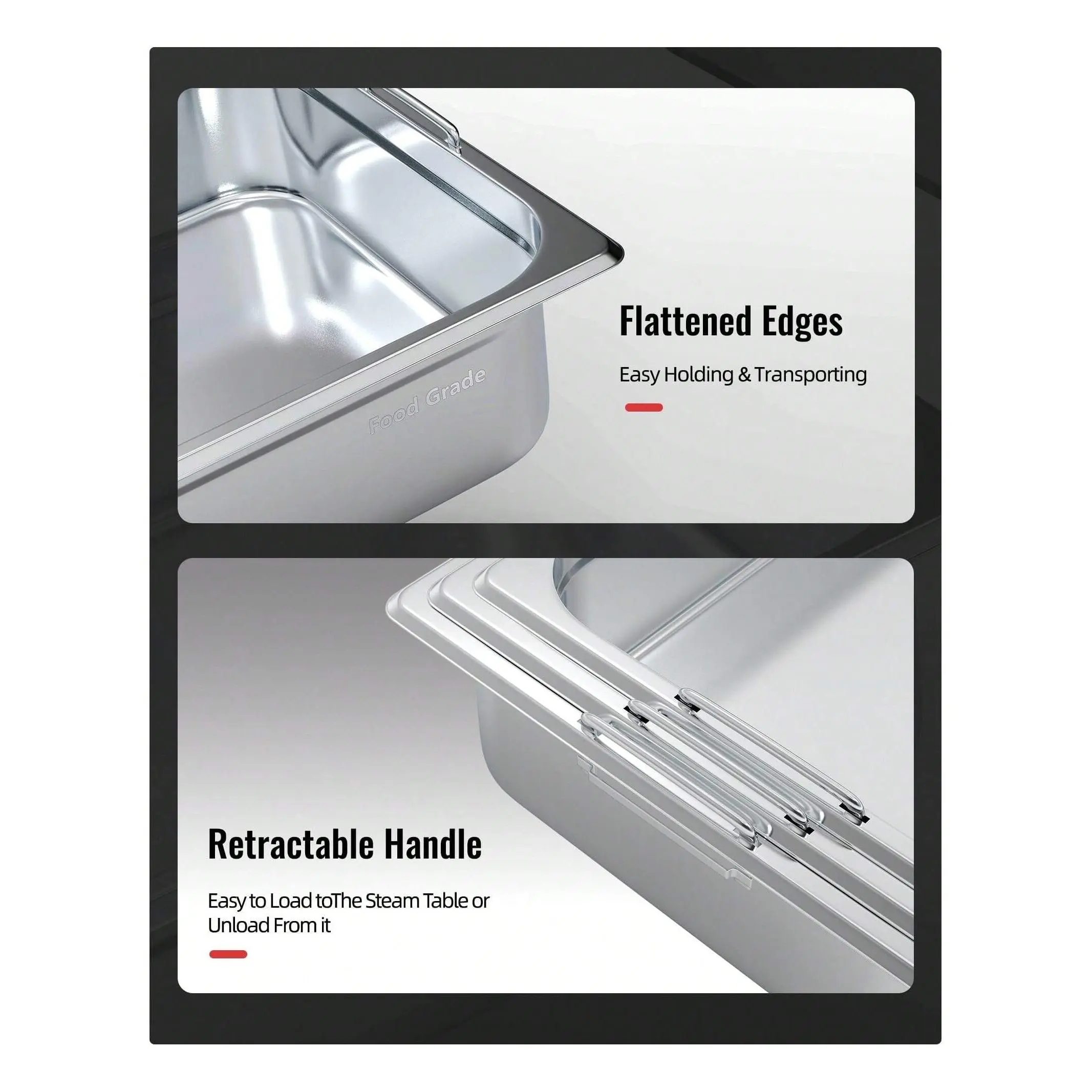 Durable Design : Our Half Size Hotel Pans are made from durable, heat-resistant stainless steel that resists dents and rust. With a thickness of 0.6mm, these pans offer a sturdy structure that won't warp, making them ideal for commercial kitchens and everyday use.