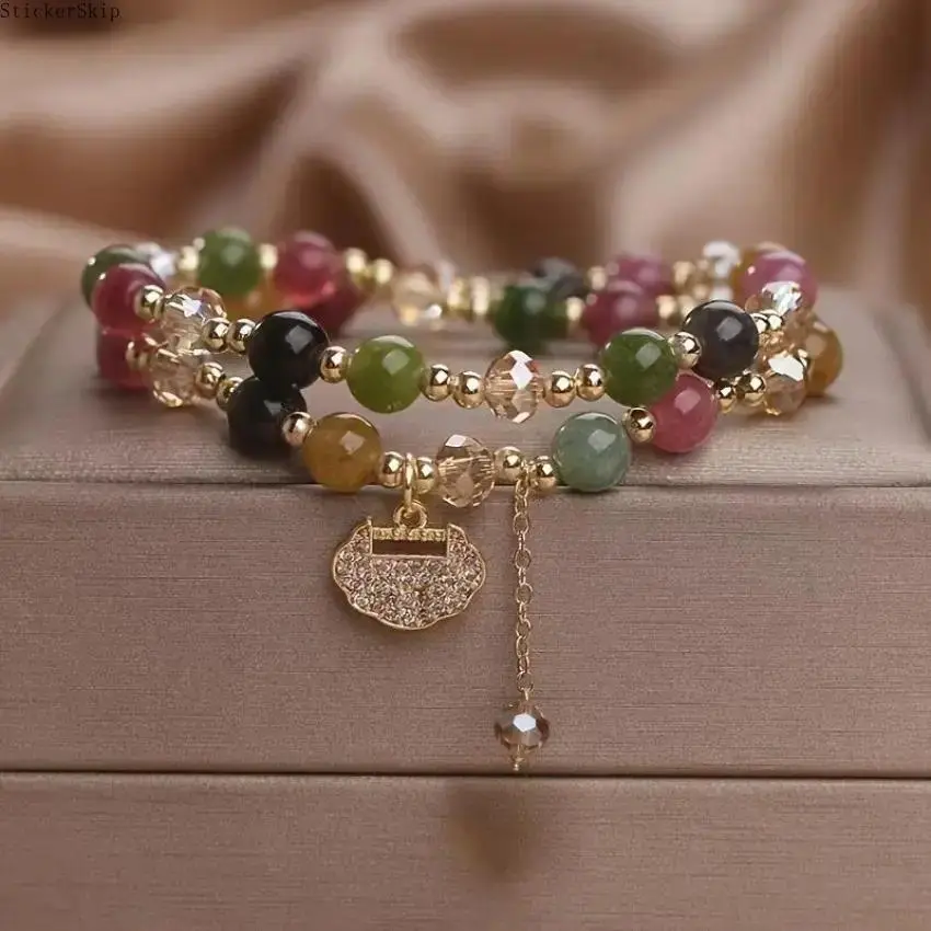 Beautiful double-layer bracelet made of colorful rainbow tourmaline round beads, paired with a delicate longevity lock charm, full of bohemian style and good blessing meaning.