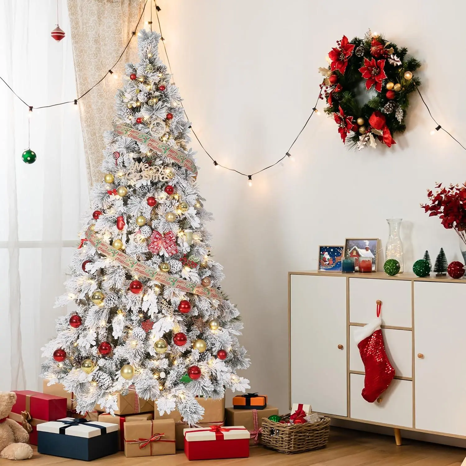 Clear Warm Lights - The pre-lit snow flocked Christmas tree is designed with warm lights, which will be a glamorous decoration to give a long-lasting brightness. It is widely used in home, apartment, shops, hotels, etc. to emit a unique Christmas light glow.