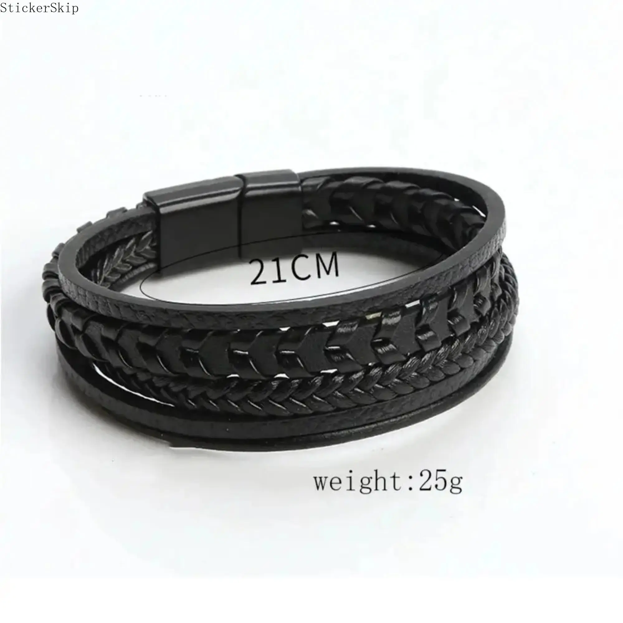 Stylish stacked multi-layer bracelet set designed for men, combining retro braided leather rope with sturdy alloy magnetic buckle, perfect for daily fashion matching.