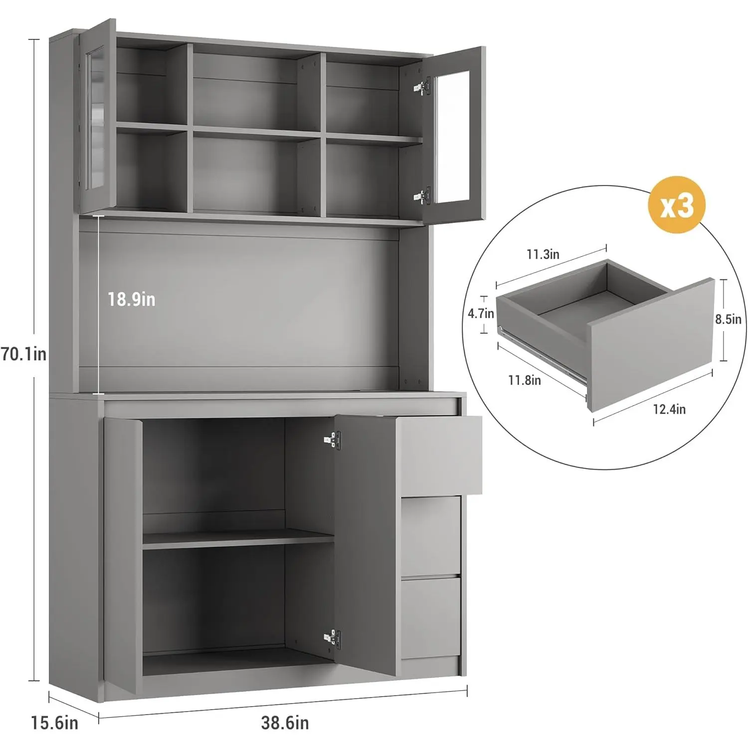 Wood cabinet with 4 adjustable shelves behind doors plus 3 smooth-gliding drawers, stores dishes/dry goods, tall narrow design maximizes depth, middle countertop doubles as workspace/display area