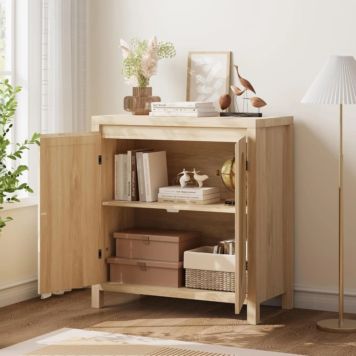 Clear fluted glass doors allow display of dishes decor or books while protecting from dust making it ideal as coffee bar or accent cabinet