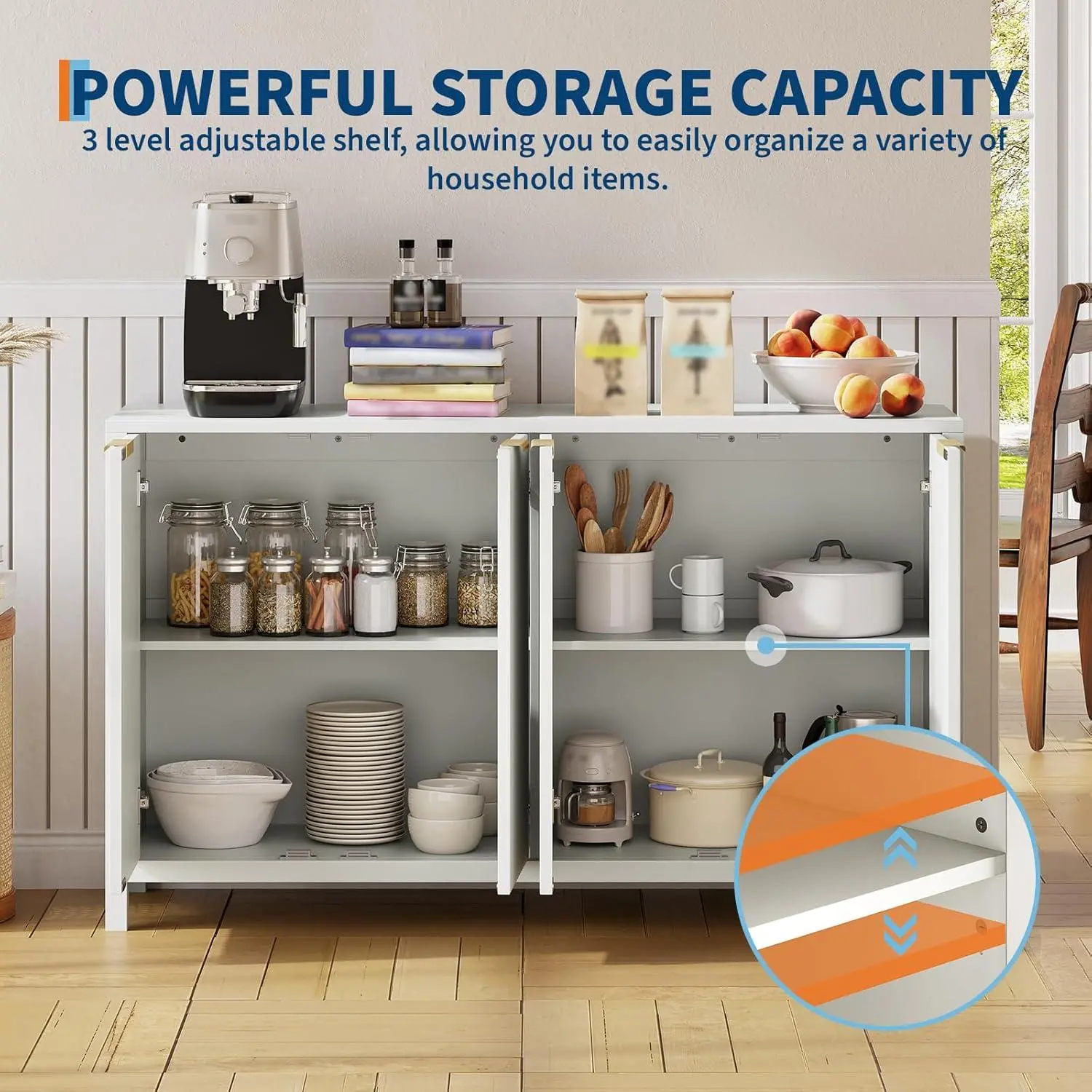 Spacious Bar Cabinet with Adjustable Storage-Designed as a versatile buffet cabinet with storage it includes 4 doors and 2 adjustable shelves each holds 50 lbs offering customizable space for dishes wine bottles small appliances or decor