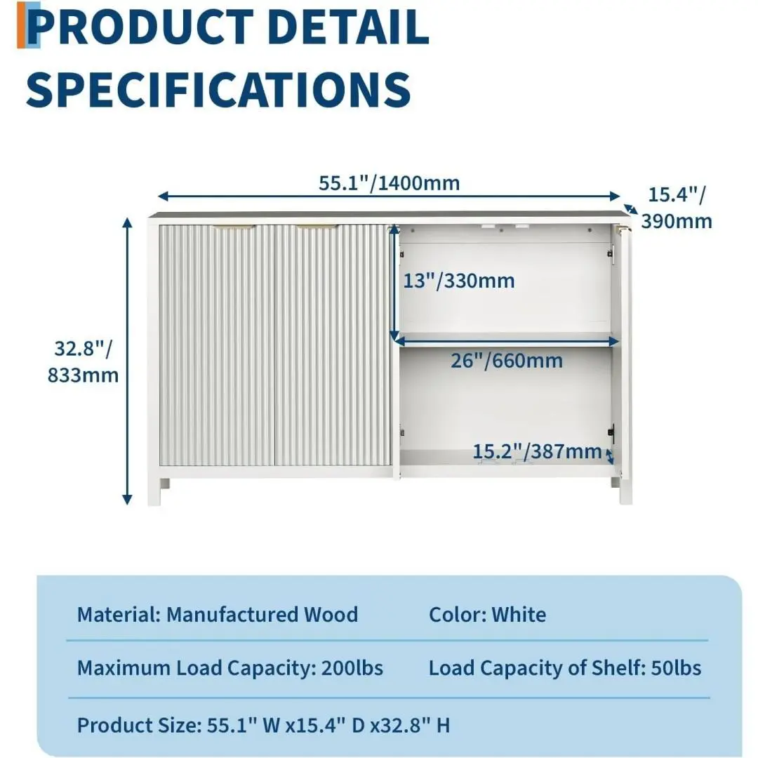 55in Fluted Buffet Cabinet with Storage Large Sideboard Modern Credenza with 4 Doors and Adjustable Shelves Kitchen Buffet Cabinet Console Table for Living Room Kitchen Entryway- White