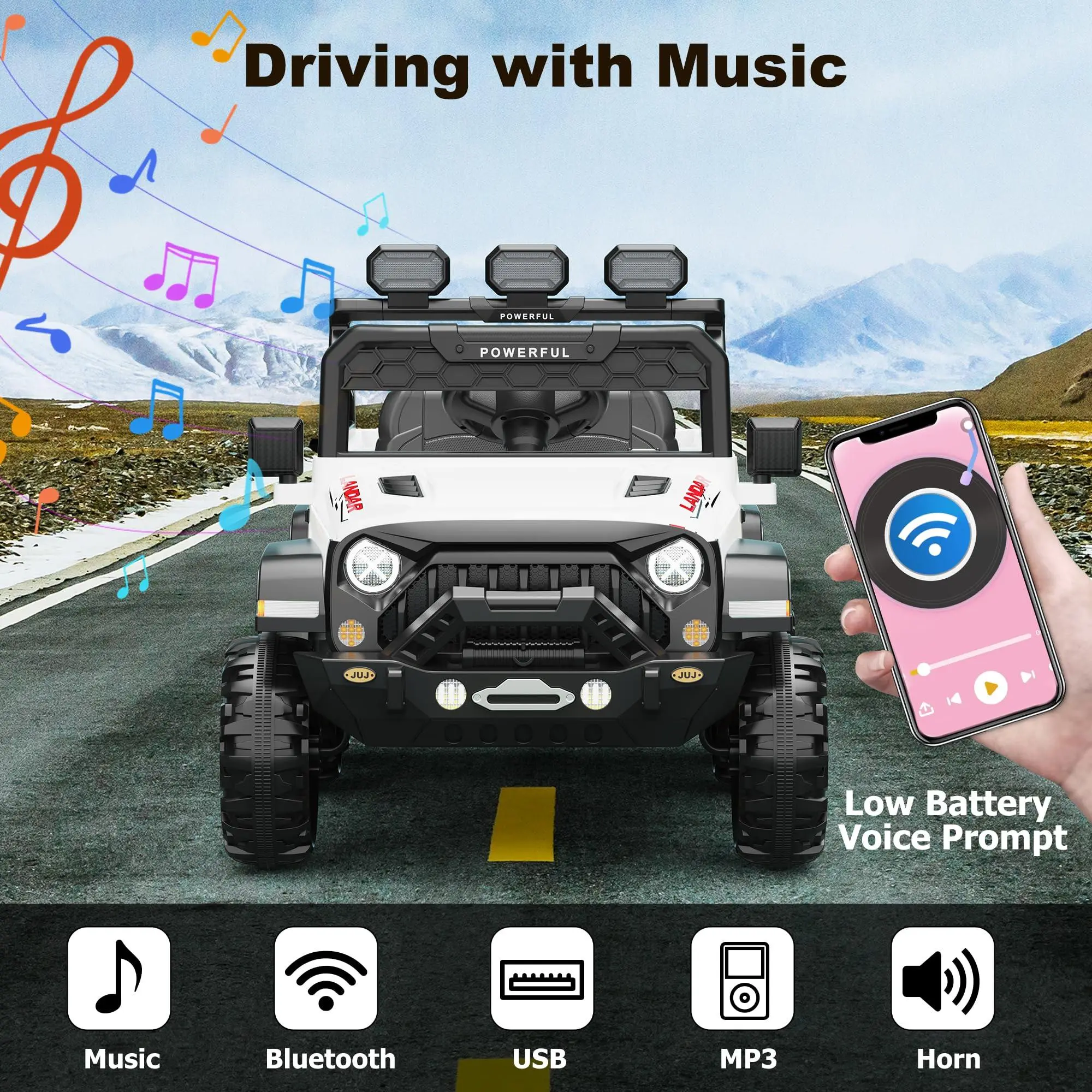Endless Fun: Enjoy multiple music options including Bluetooth, USB, AUX, and MP3, ensuring your child's adventure is filled with fun. The power wheels 24V features realistic engine startup sounds and lifelike driving operations for an immersive riding experience. Search for "YJ-ZK57" to connect bluetooth