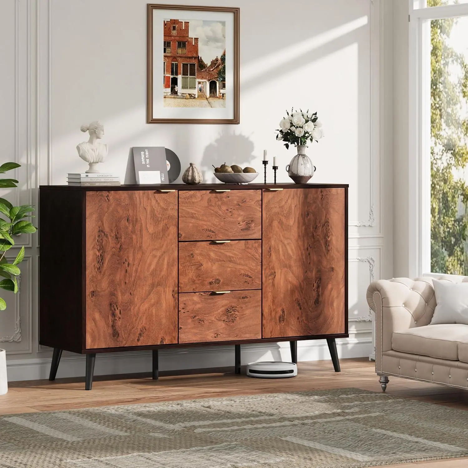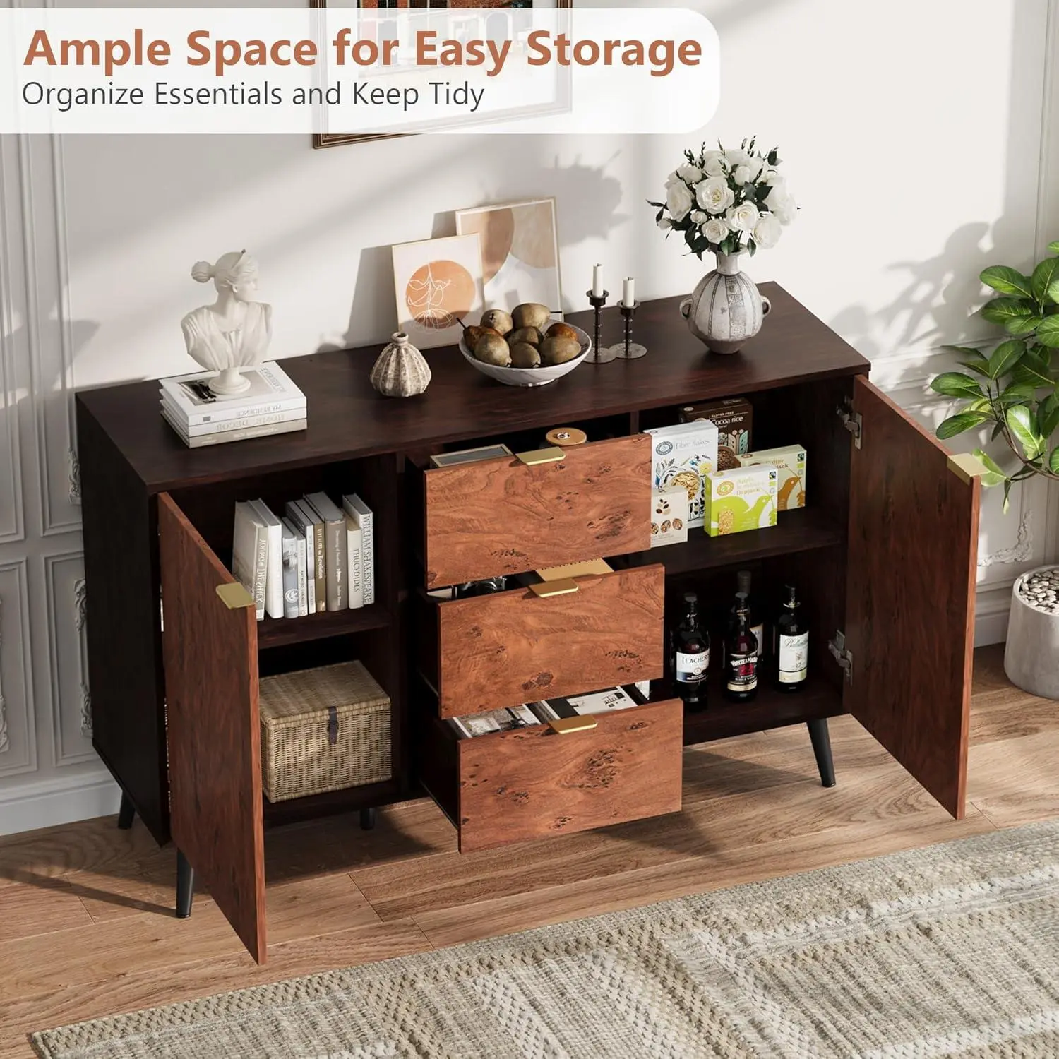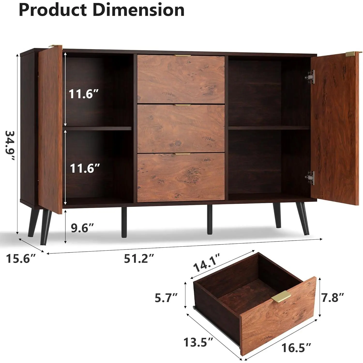 Brown 51.2-Sideboard Buffet Cabinet with 3 Drawers-Farmhouse Kitchen Wooden Cabinet with Storage-Gorgeous Burl Texture-Coffee Bar for Dining Room/Living Room- Walnut