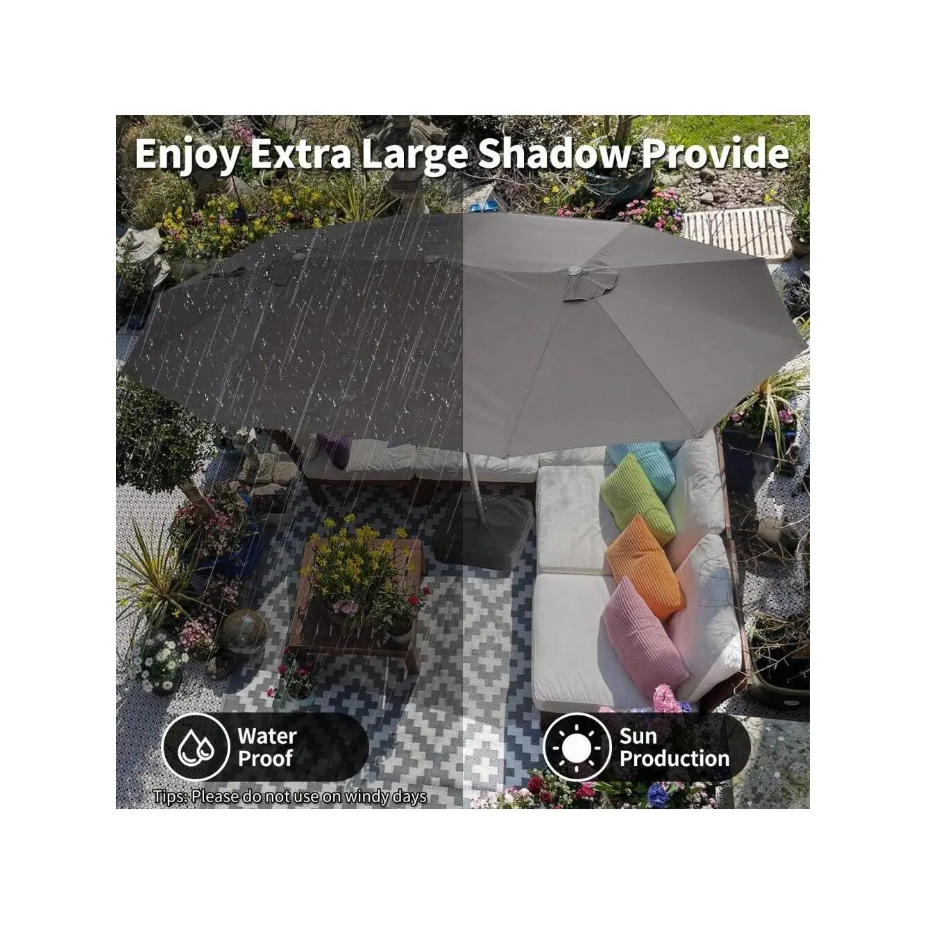 [Oversized Sunshade with Base]This 15-foot long extra-wide patio umbrella features an oversized double-sided design, which greatly increases the shade area for users and provides 360° shade for you and 3-8 people. The unique double canopy design blocks the sun from both sides, perfect for lounging by the pool or outdoor dining.