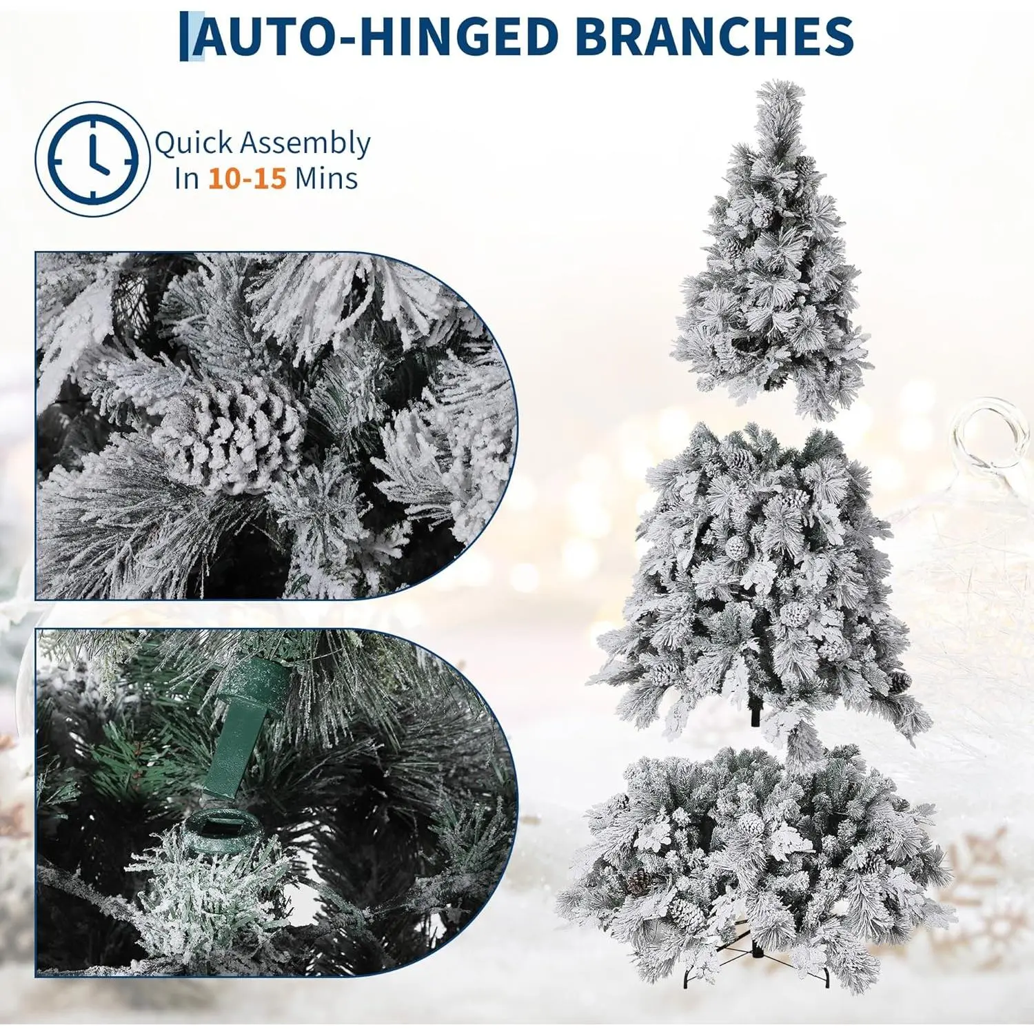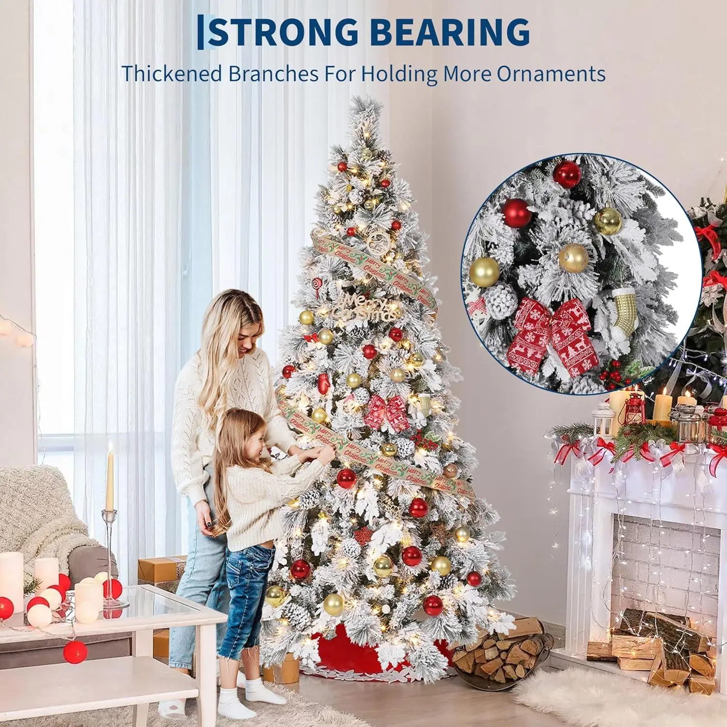 Clear Warm Lights - The pre-lit snow flocked Christmas tree is designed with warm lights, which will be a glamorous decoration to give a long-lasting brightness. It is widely used in home, apartment, shops, hotels, etc. to emit a unique Christmas light glow.