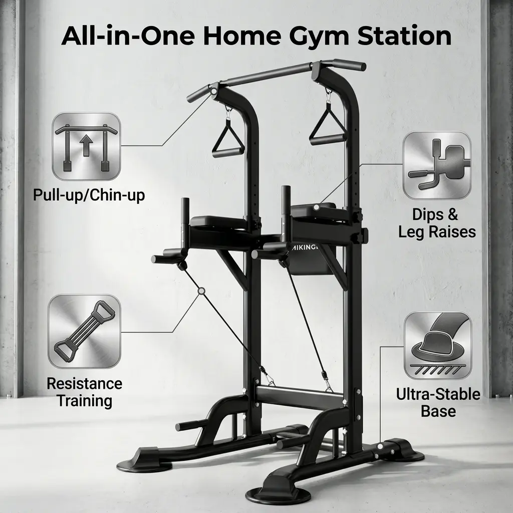 This multi-functional pull-up bar stand is perfect for your home gym. It doubles as a dip station, offering versatile training options. The adjustable height design ensures a comfortable fit for various users. This equipment is a must-have for strength training and fitness enthusiasts. It's designed to enhance your workout routine with its practical features.