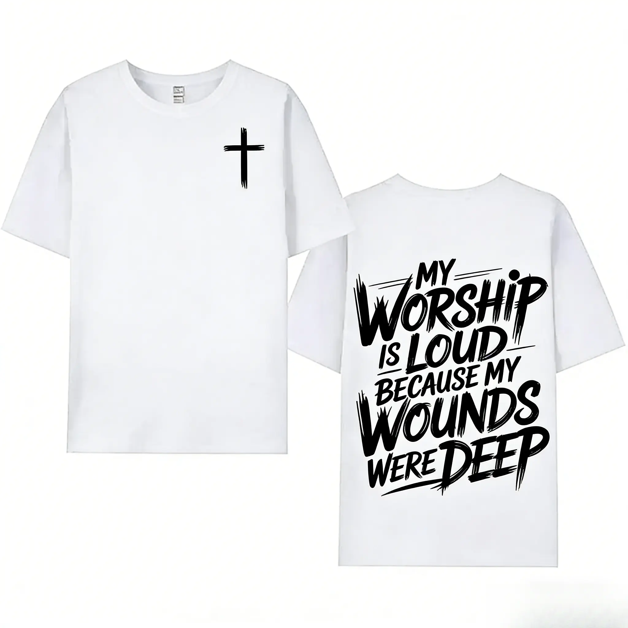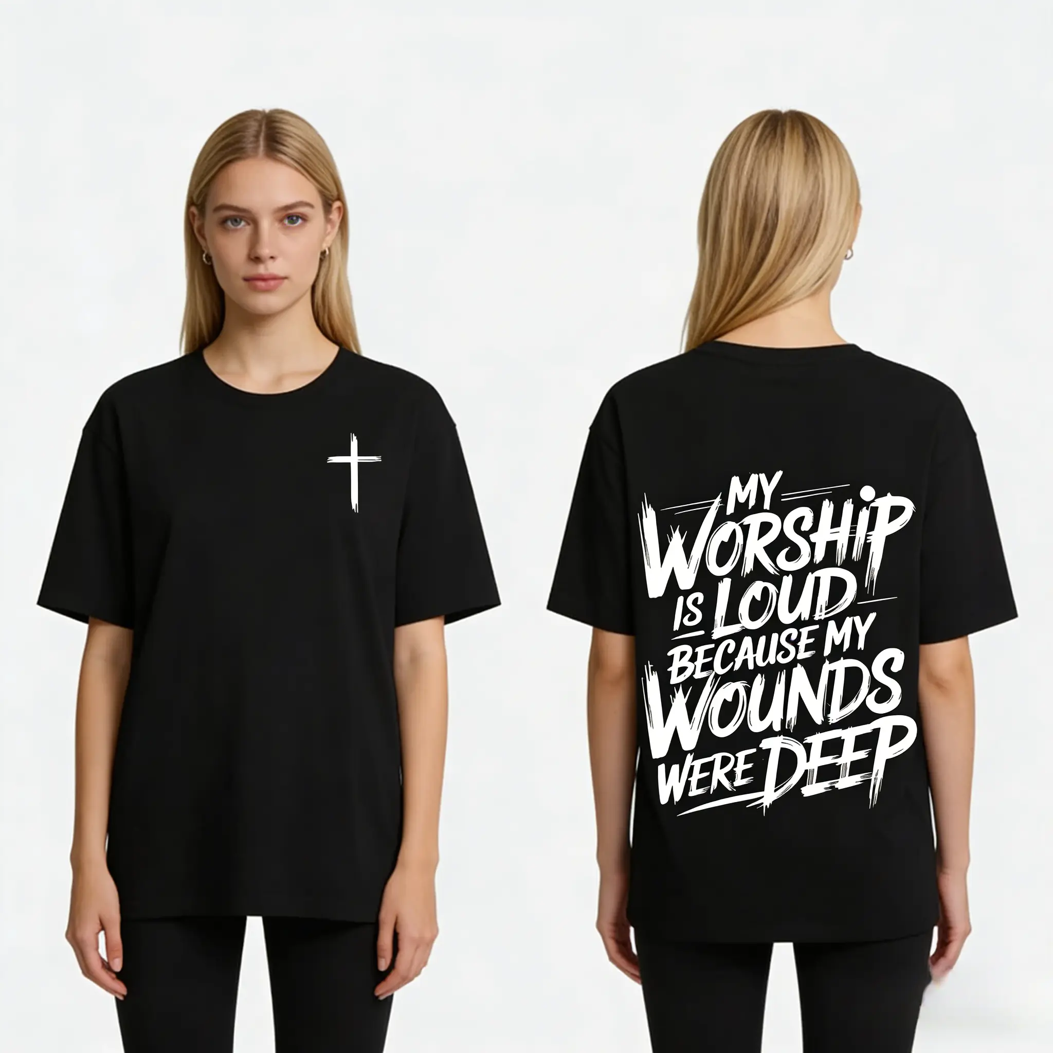 Featuring the powerful message "My Worship Is Loud Because My Wounds Were Deep," this design carries a deeply meaningful and faith-driven expression that resonates with strength, healing, and personal testimony. The scripture-inspired wording combined with a vintage aesthetic creates a bold yet heartfelt statement, making it a meaningful piece for those who want to share their faith and story through what they wear. Ideal for church, gatherings, or everyday inspiration, it brings a strong, uplifting presence while keeping your style expressive and authentic.