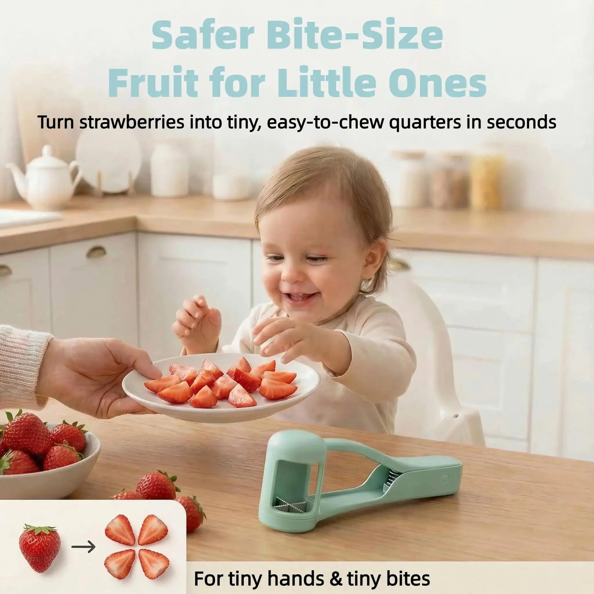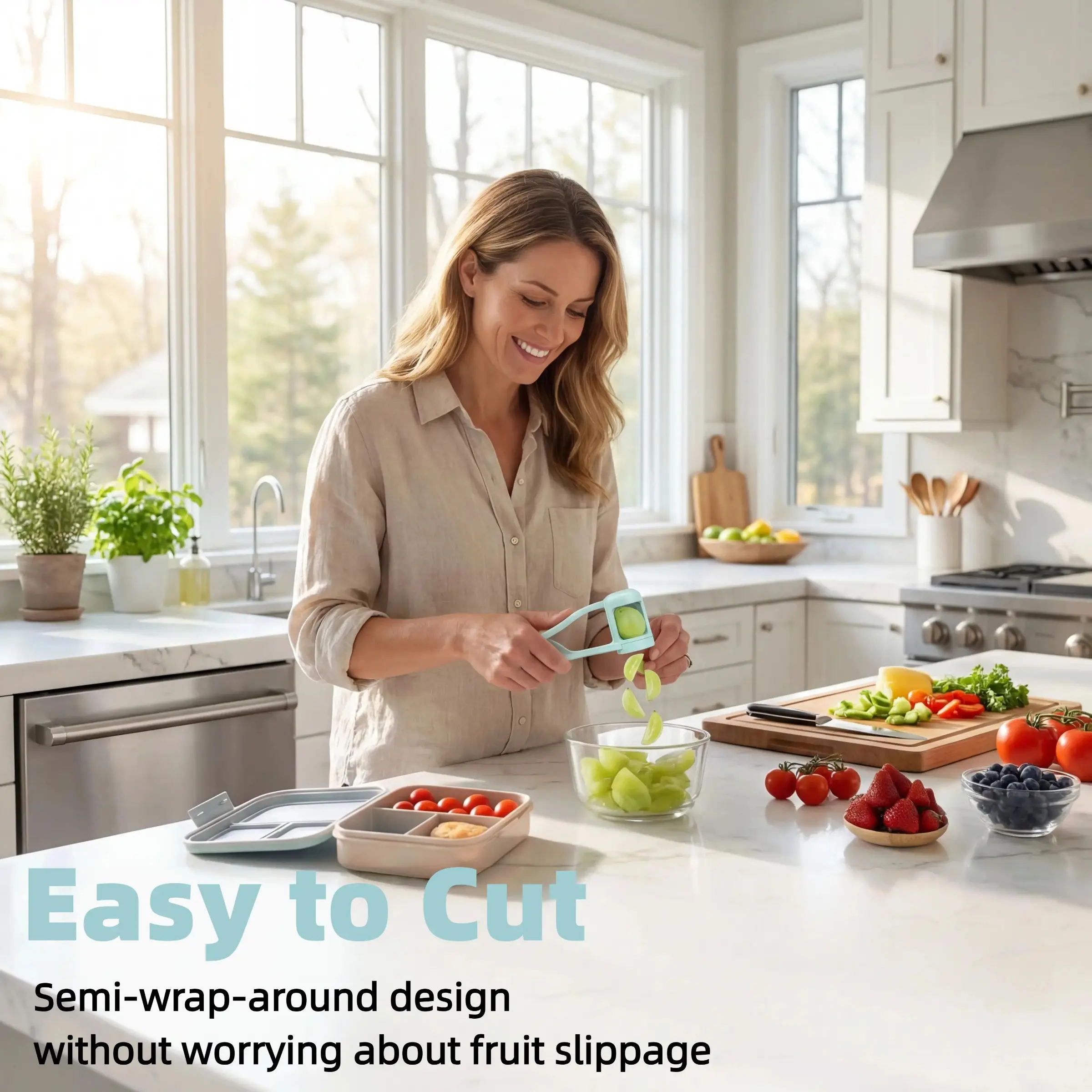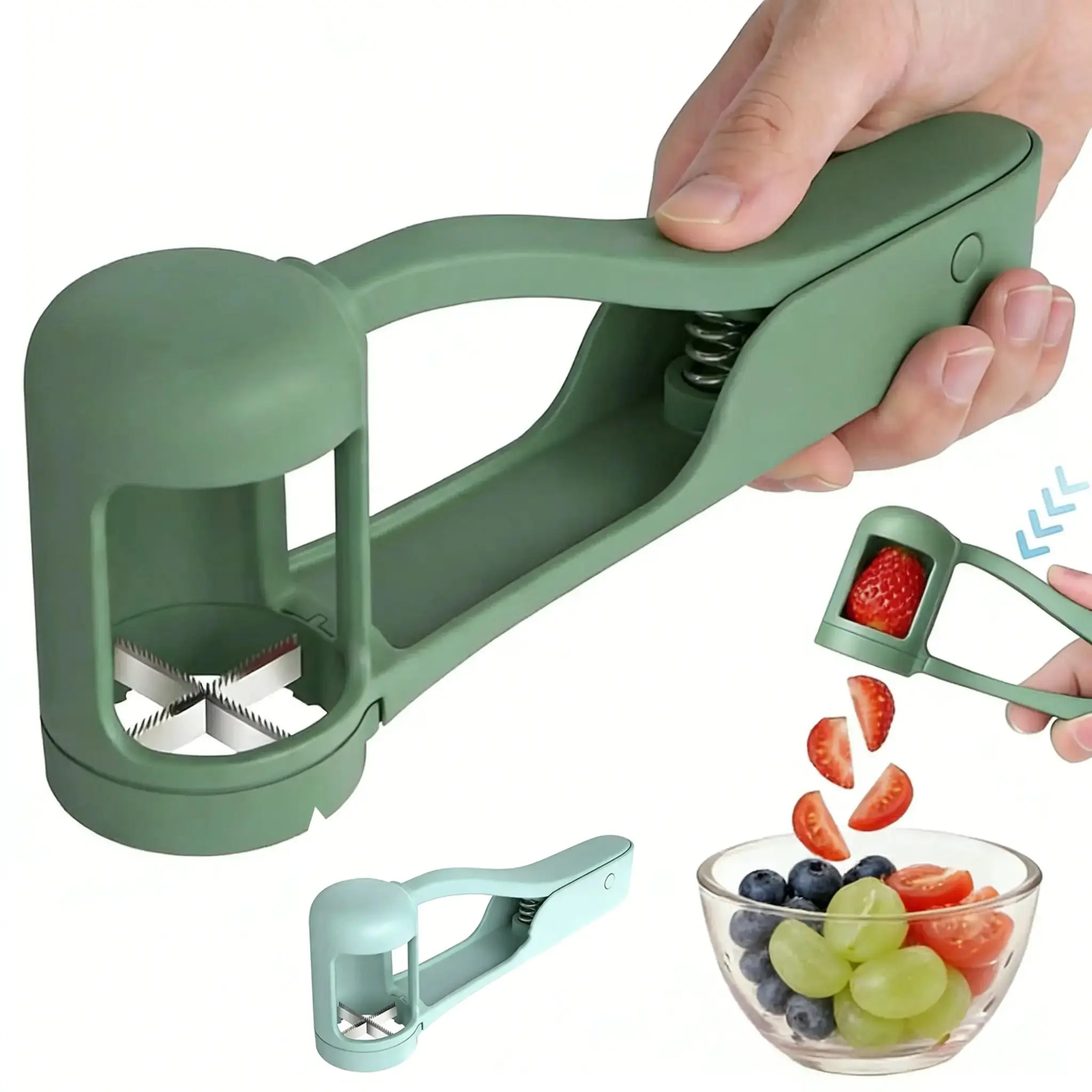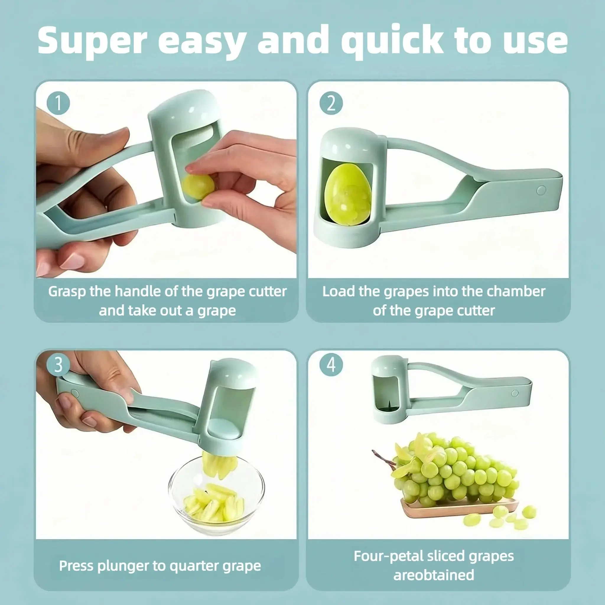 ·【Effortless Fruit Cutting】This grape cutter features a unique patented design that allows you to effortlessly slice fruits into four pieces with just a gentle press of your thumb. Its automatic spring-back mechanism makes single-handed operation effortless, requiring no force, and prevents fatigue even during continuous cutting, greatly enhancing kitchen efficiency.