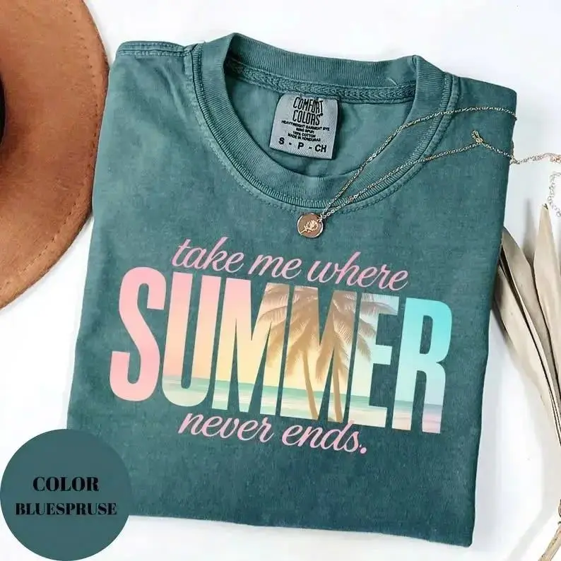 Comfort Colors Take Me Where Summer Never Ends Beach Tee for Women, Summer Graphic T-Shirt for Coastal Aesthetic Gift, Apparel Made In The USA