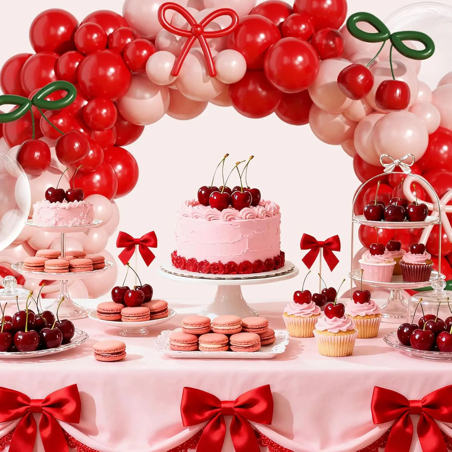 Create a beautiful cherry inspired balloon arch using vibrant red and pink tones with elegant long clear balloons perfect for stylish party setups