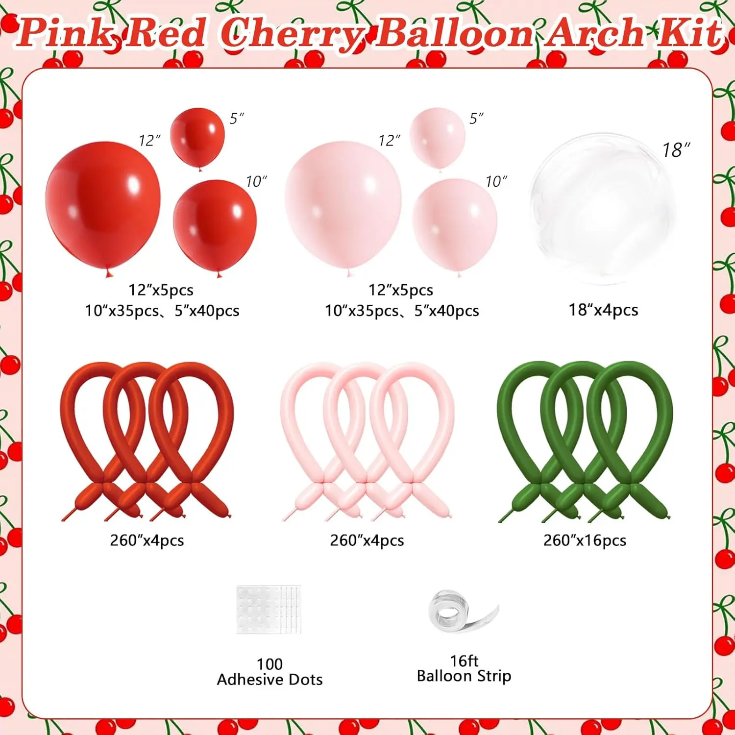 184 Piece Red Pink Balloon Arch Set with Long Clear Balloons for Cherry Theme Party Decor