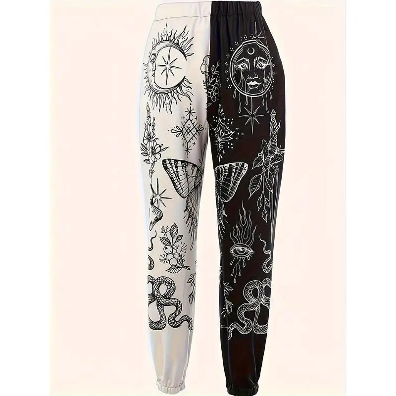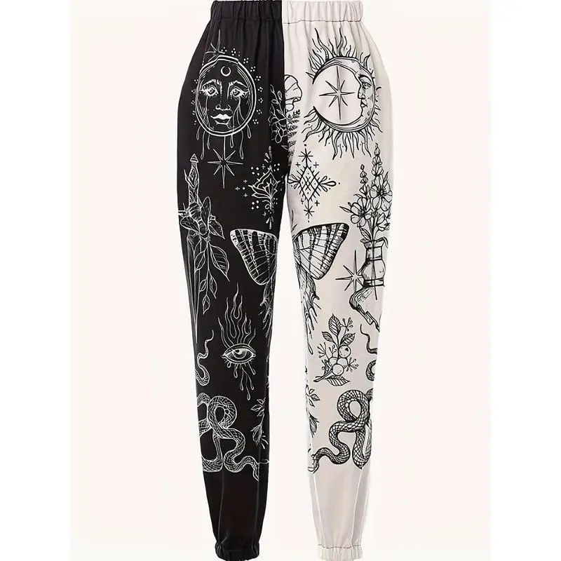 [Colorblock Graphic Print Joggers] High Waist Colorblock Graphic Print Joggers - Women's Bohemian Hippie Yoga Pants, Polyester,