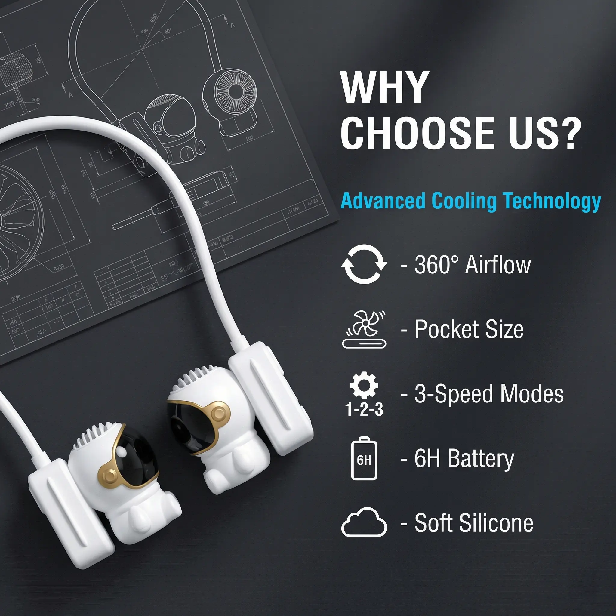 【Stylish, Safe & Natural Cooling】This neck-worn personal fan features a trendy astronaut-inspired design, perfect for elevating your summer style. Its user-centric, user-friendly design ensures complete safety for both kids and the elderly. What’s more, its precision-engineered air outlets prevent direct wind from hitting your body, allowing you to enjoy a gentle, natural and soothing cooling breeze all day long.