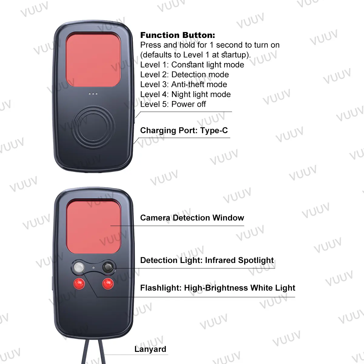 The detector has 4 functions, which are respectively: Function 1: Constant light mode (Normal detection). Function 2: Flashing mode (enhanced detection). Function 3: Vibration alarm mode. Function 4: Lighting mode. Usage method: Working principle: When detecting with infrared light, the lens of a miniature camera will produce reflective bright spots, helping you locate the miniature camera. Press and hold the power button to enter Function 1. Observe through the detection window; if there is a reflective bright spot, a micro camera may be present. Press the power button again to enter Function 2 (enhanced mode). The infrared light flashes rapidly. Observe through the detection window; positions with high-frequency flickering bright spots may have micro cameras. Press the power button again to enter Function 3. The detector will sound an alarm when it senses vibration. It can be hung on door handles, travel suitcases and the like for use. Press the power button again to enter Function 4 and switch to lighting mode, which can be used as a flashlight. Press the power button once more to power off the device.