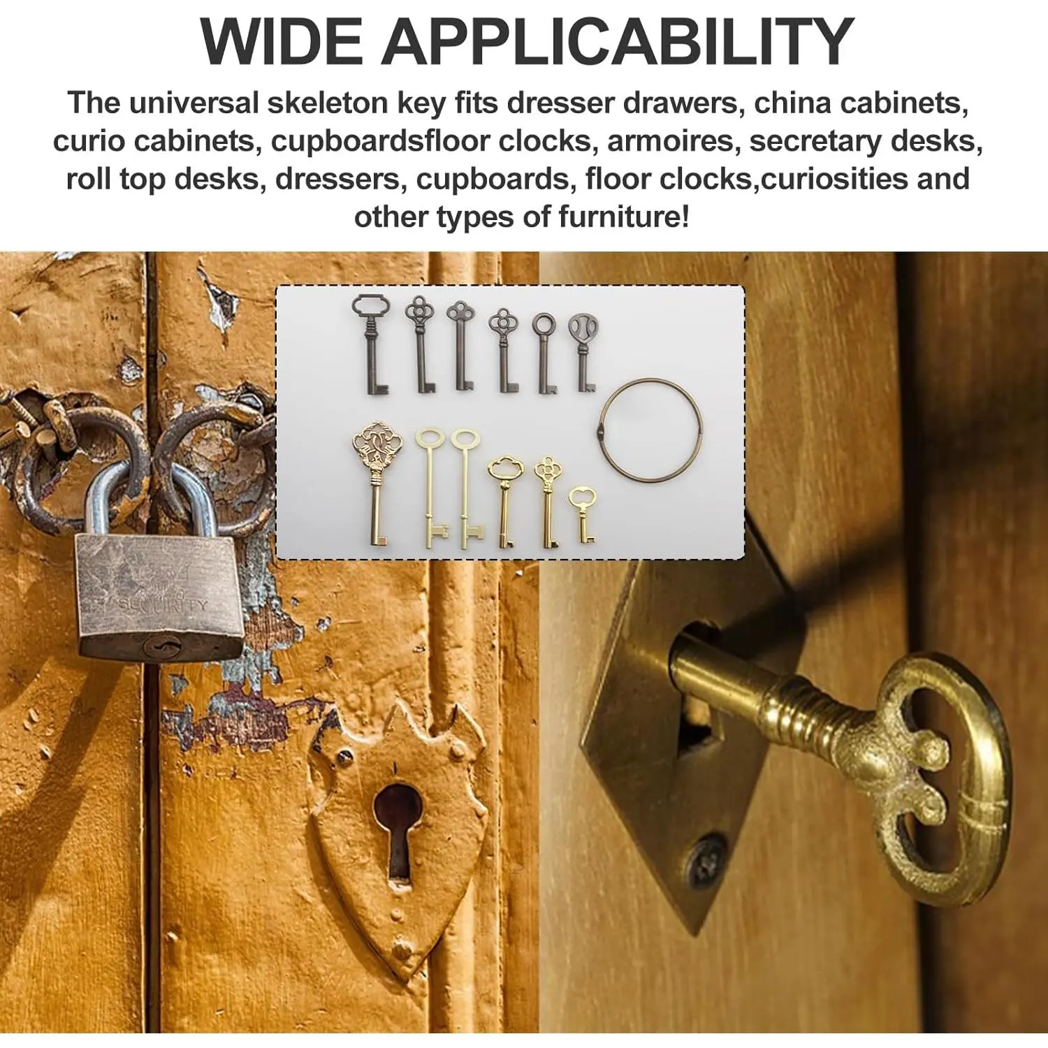 [Rich Selection]Contains 12 unique keys for a variety of antique furniture, such as curiosity cabinets, porcelain cabinets, grandfather clocks, dressers, cabinets, roll-top desks, etc., providing a rich choice for antique lovers.
