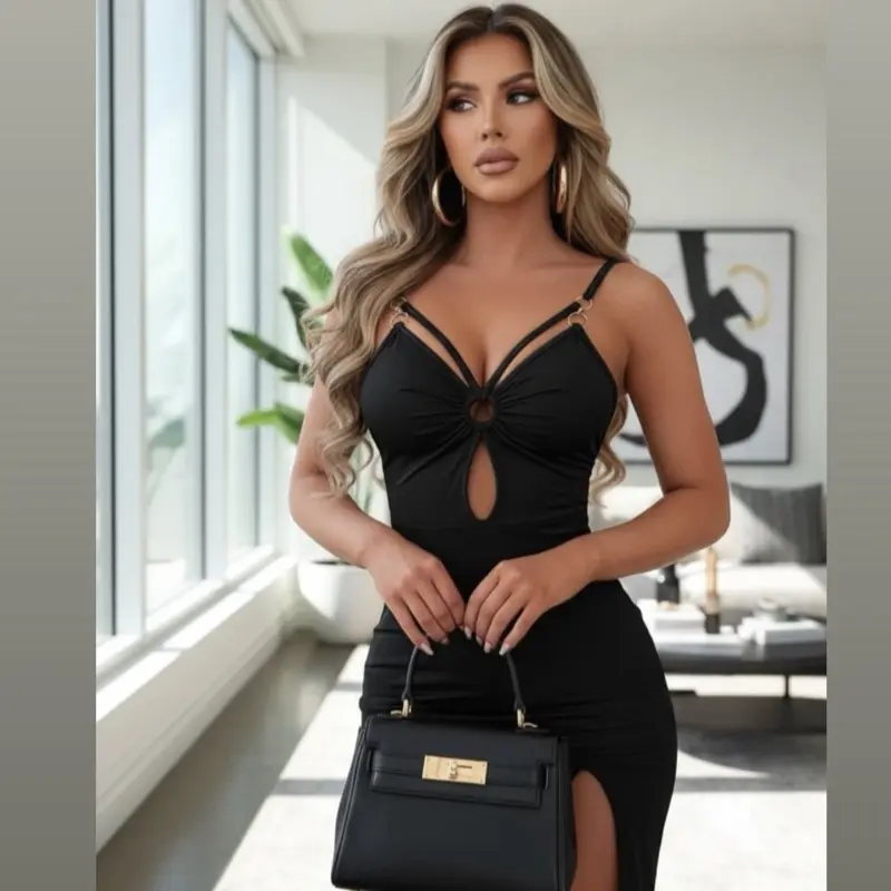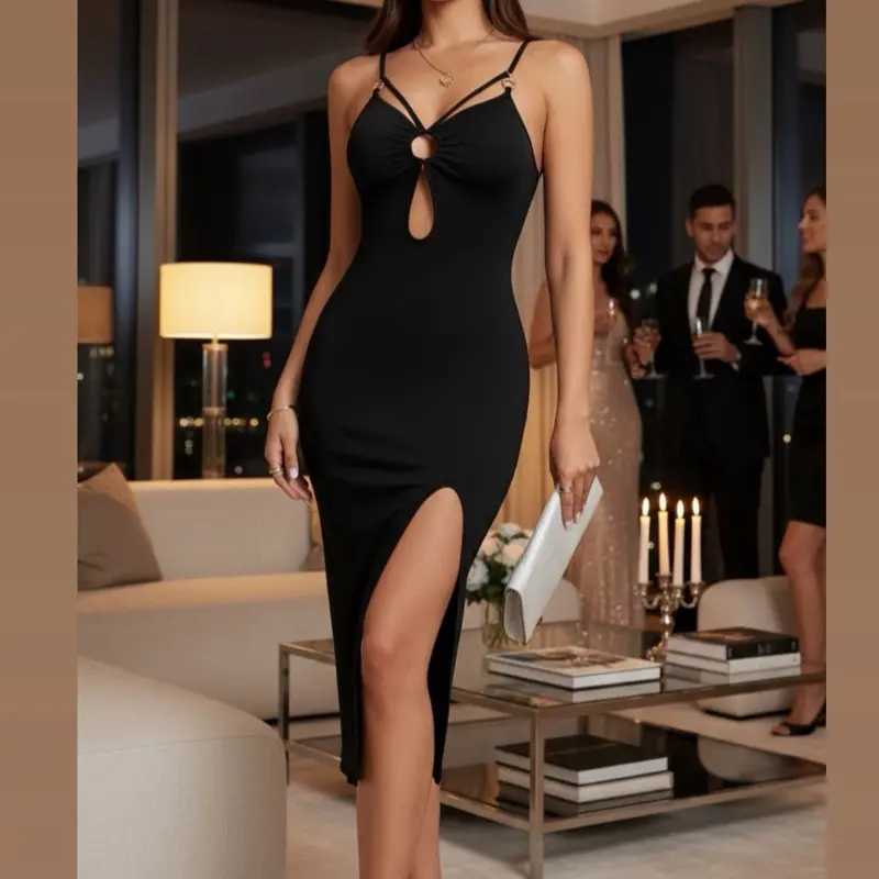 El vestido "Luz Nocturna" es una explosión de audacia y glamour. Se ciñe al cuerpo como una segunda piel, con un escote provocador y cortes estratégicos que despiertan miradas. El aro central atrapa la atención, y la abertura lateral enaltece cada paso. Es un símbolo de empoderamiento, perfecto para conquistar la noche.