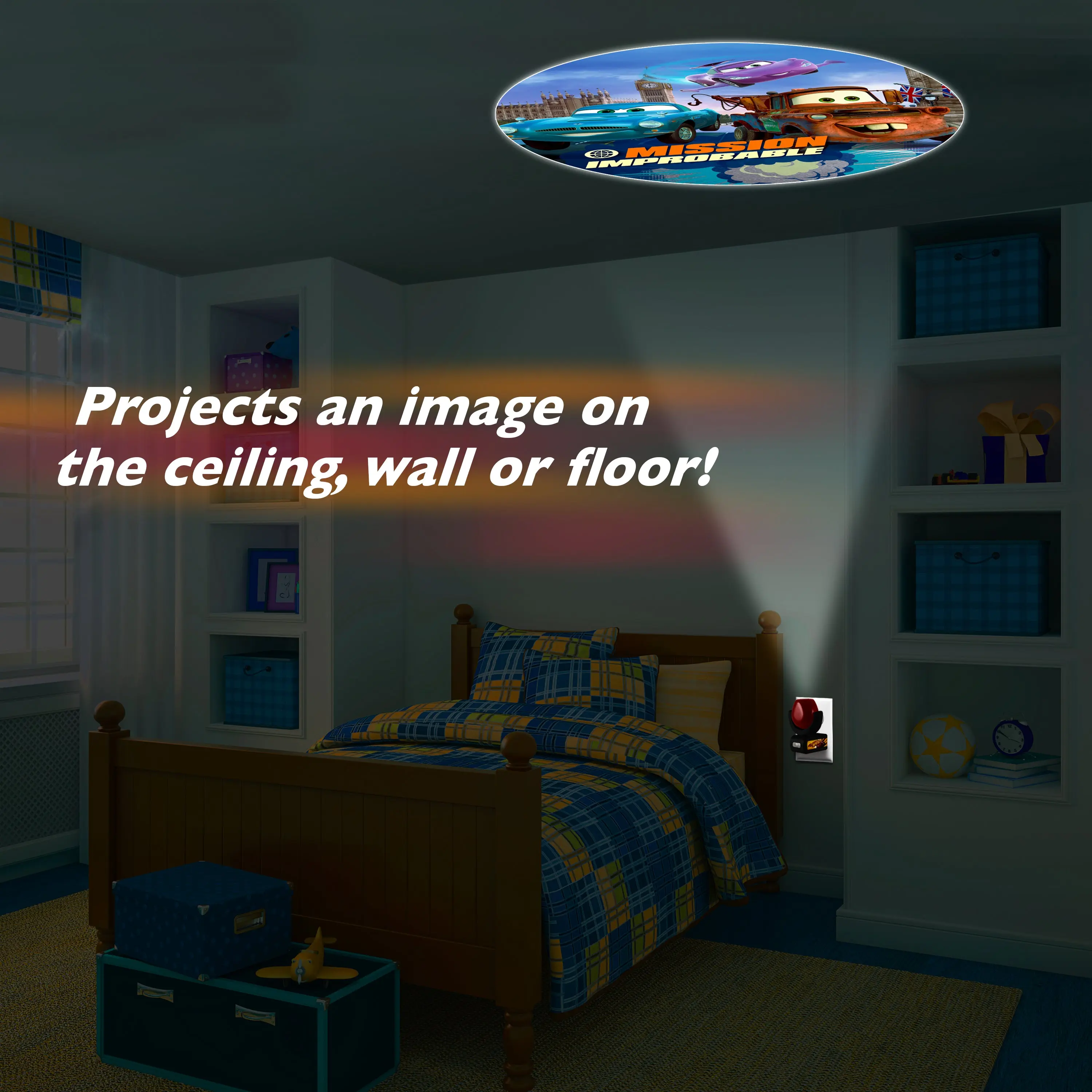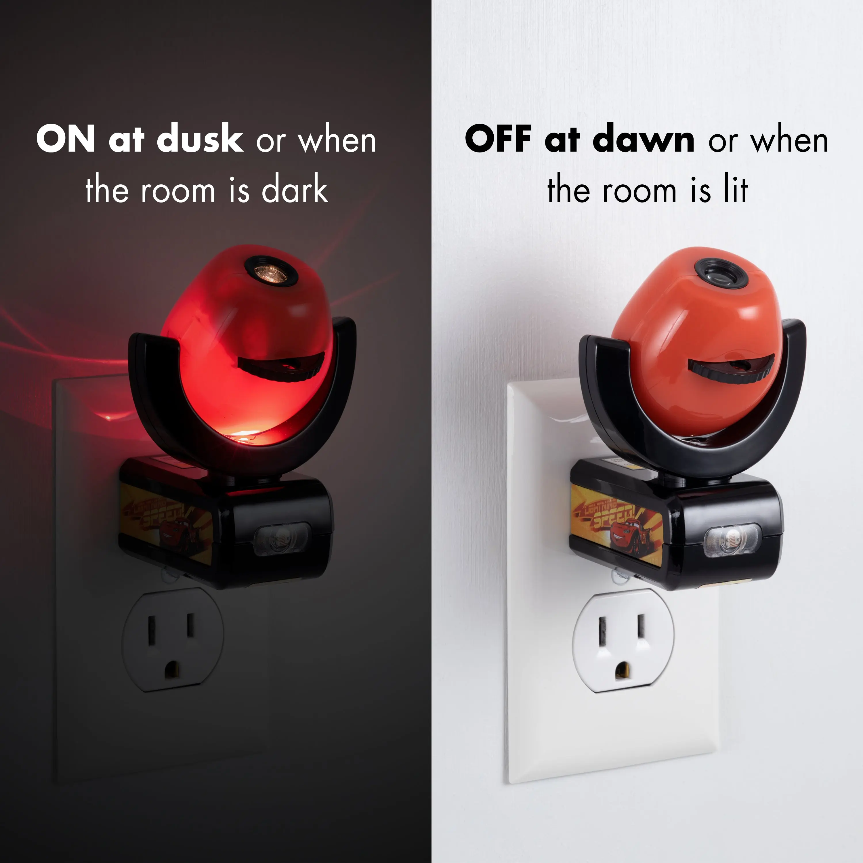 Transform your child's room with this Pixar/Disney Cars Projectables Night Light! The Projectables LED night light provides a soothing guide light while projecting one of six Cars images at a time on the wall, ceiling, or floor. It uses light-sensing technology to turn on at dusk and off at dawn. Long-life, energy-efficient LEDs are cool to the touch making this night light safe for any room in your home. It's perfect for kids of all ages.