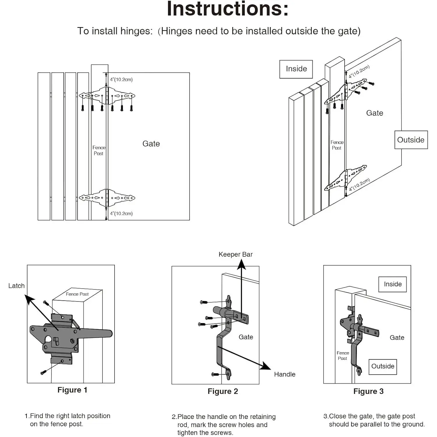 Packaging Includes:Outdoor gate hardware kit package include 2 Pcs 8" decorative strap hinges,1 Pcs wood gate latch ,1 Pcs handle and mounted screw hardware