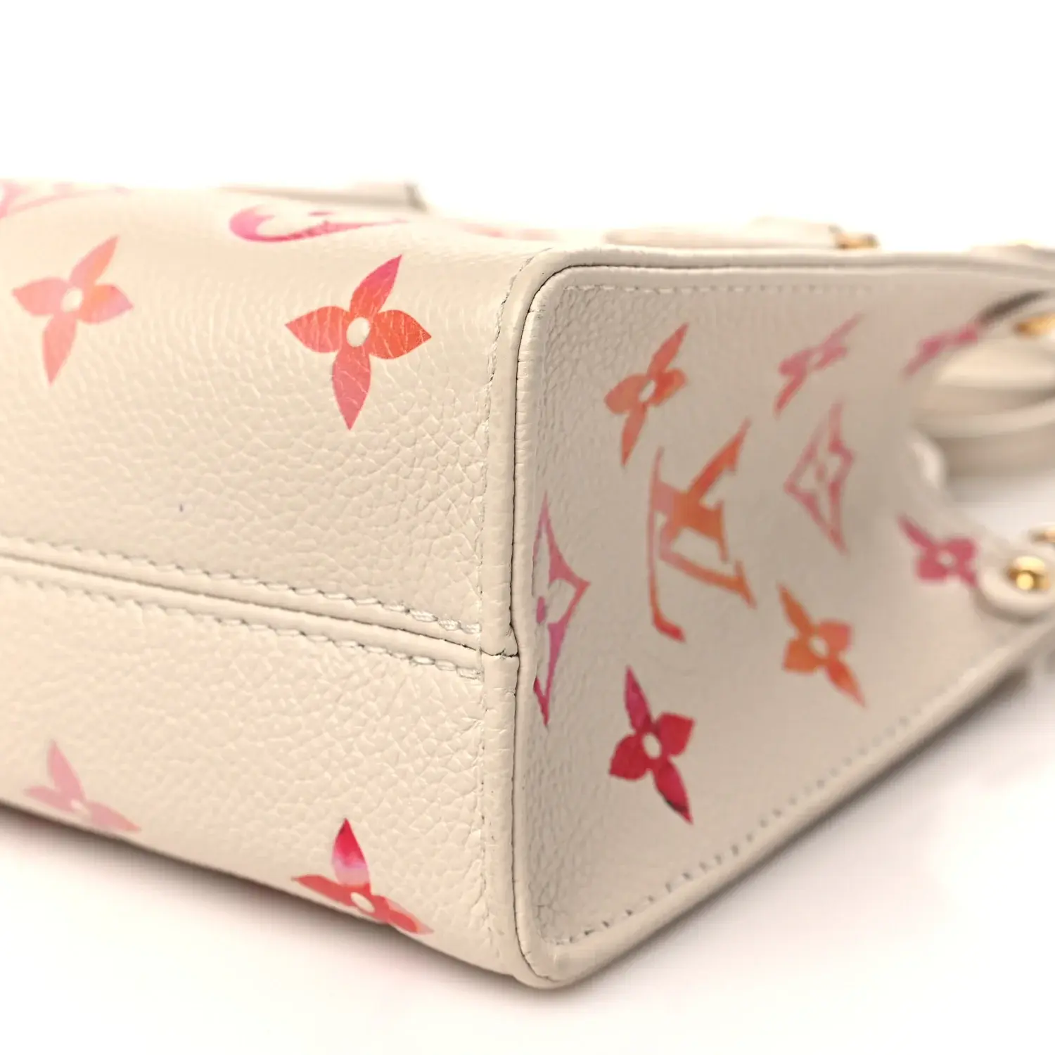 This is an authentic LOUIS VUITTON Empreinte Monogram Onthego BB in Sunrise Aquarelle. This limited edition tote features colorful versions of the classic Louis Vuitton monogram leather. The bag features white leather top handles, an optional leather shoulder strap, and gold hardware. The top opens to a spacious microfiber interior with a patch pocket.