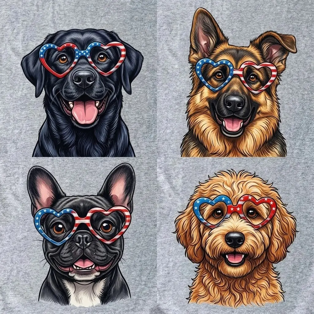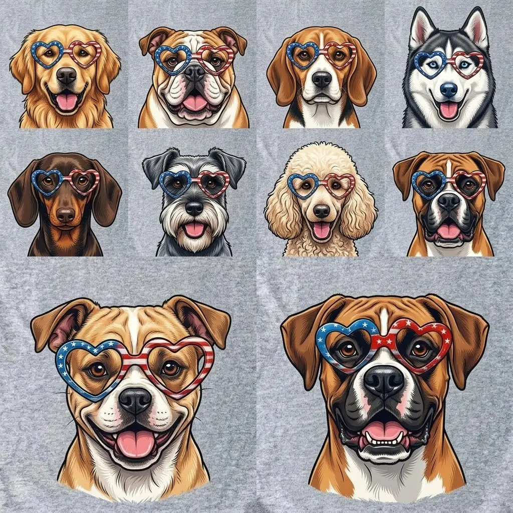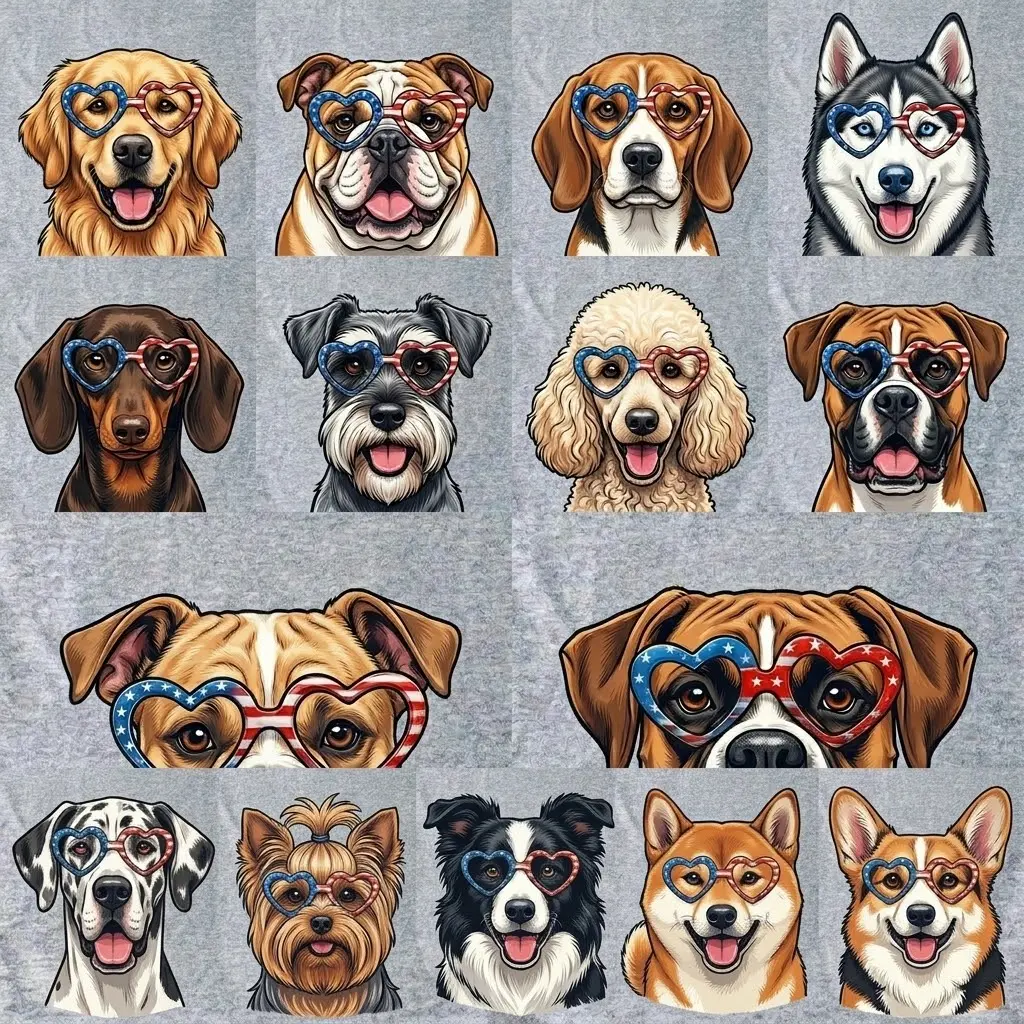 Find your perfect match in our exclusive Patriotic Dog Collection! We’ve designed these adorable tees featuring 18 different breeds, each wearing iconic USA Flag heart-shaped sunglasses. Whether you're a Frenchie fanatic or a Golden Retriever lover, we have the perfect shirt for you!