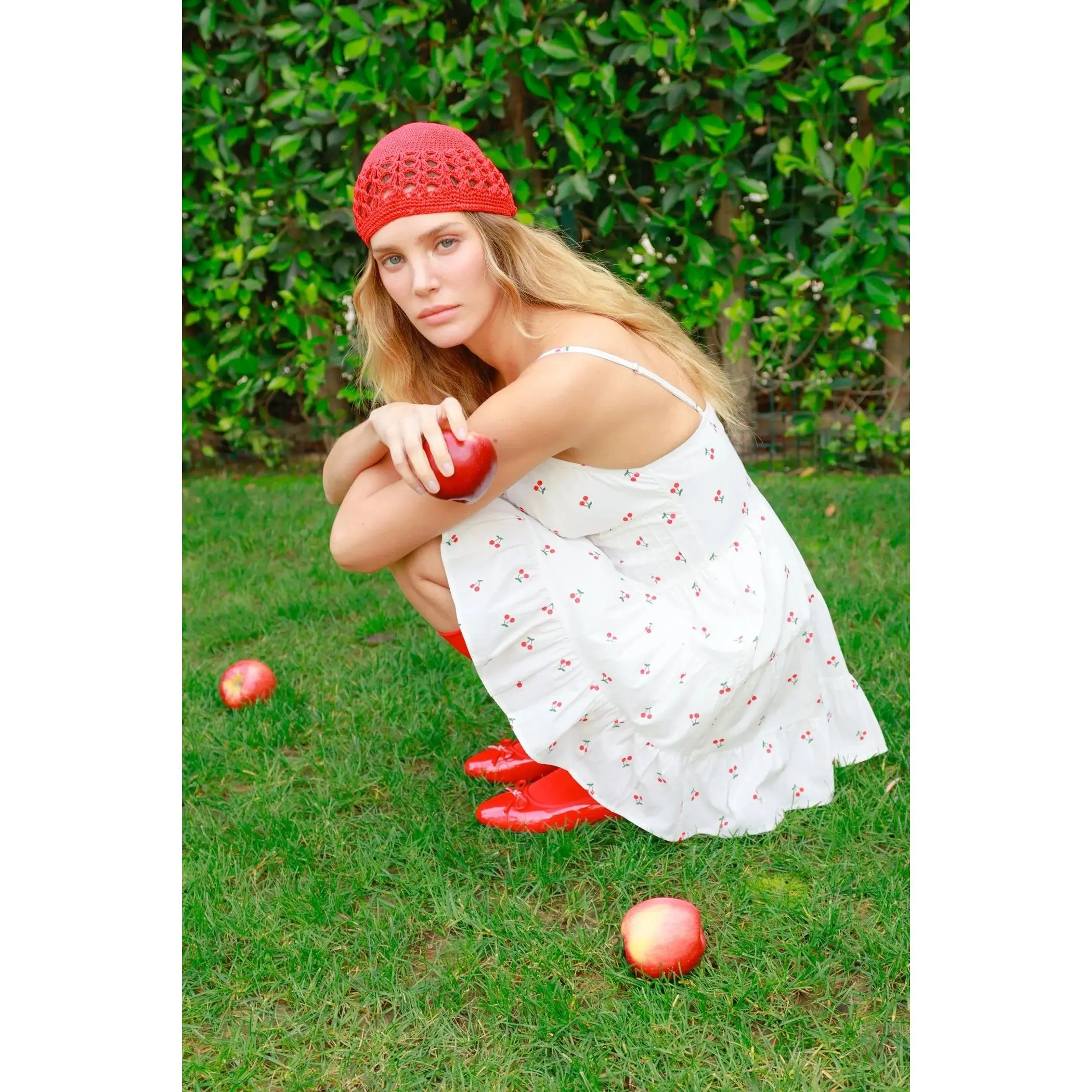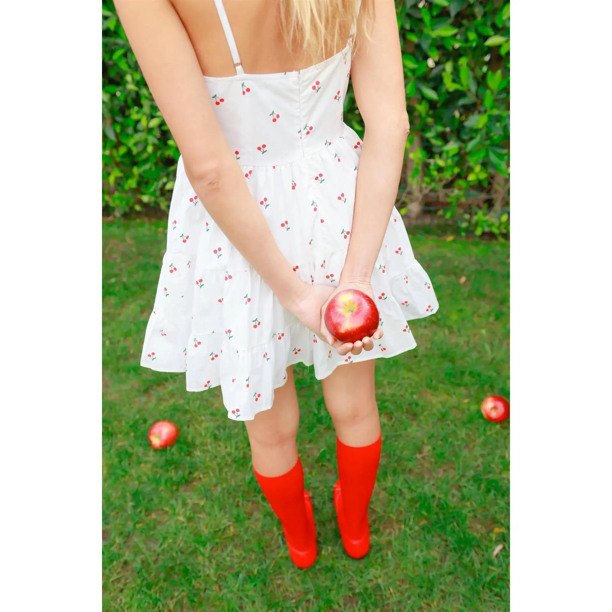 This mini dress boasts a spaghetti strap design and a sweetheart neckline, featuring cherry print fabric that adds a playful touch. The tiered silhouette enhances movement and flair. Pair with strappy sandals and a woven handbag for a summery day out.