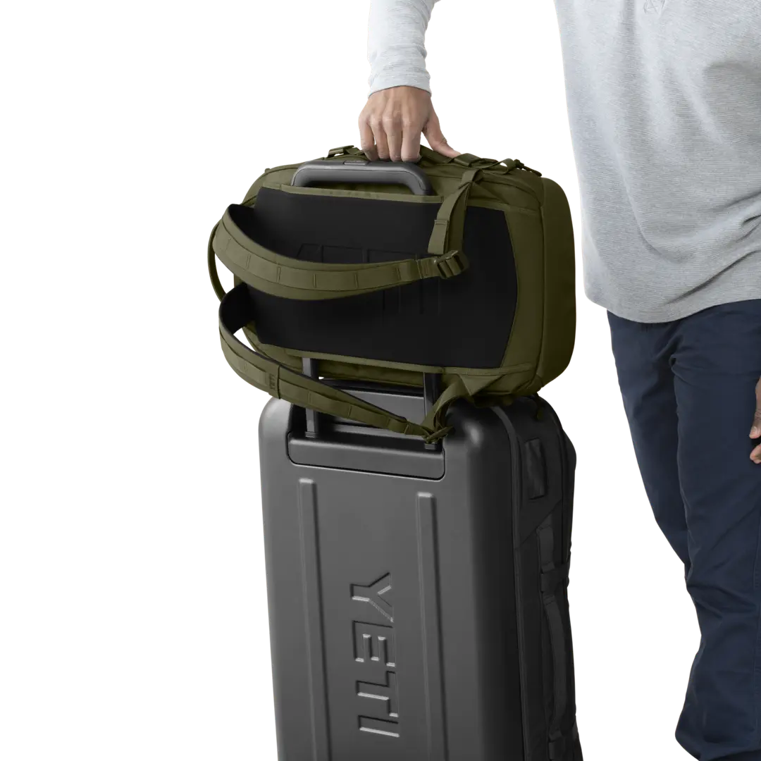 Thought you couldn't have a backpack tough enough to go from the train to the trailhead? Think again The Crossroads 27L pack yearns for a detour from your daily routine. Made from 700 Denier, water and abrasion-resistant TuffSkin Nylon, this bag makes no compromises. It's built with a large main compartment, two Rambler Bottle pockets, and open wide for easy loading and unloading. Pro tip: When you're traveling, secure your pack to the top of your roller with the luggage pass-through sleee.